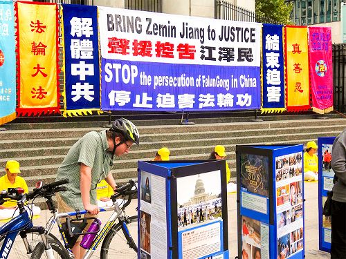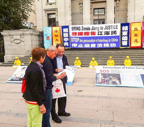 老华侨王先生为法轮功学员的活动所吸引,与现场法轮功学员交谈了解更多情况,并签名支持诉江。王先生对记者表示,现代社会物欲横流,人们很少关心信仰,法轮功学员的反迫害活动非常可贵。王先生用手指着心脏部位强调说,中共干了很多坏事,江应该被起诉,这是振奋人心的好事。王先生离开活动现场时还带走了法轮功真相光盘等真相资料。