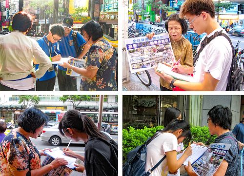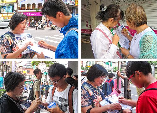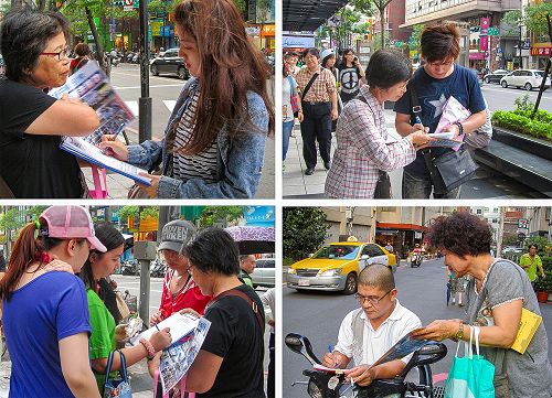 台湾新北市中和及永和,两地区部份法轮功学员,于二零一五年九月五日、及十三日下午,在永安捷运站前人行道及公车站附近,向熙来攘往的民众讲述法轮功的真相、传递诉江讯息,并征集签名声援诉江。很多人了解真相后在征签表上签名,向法轮功学员感谢致敬,并鼓励坚持下去。