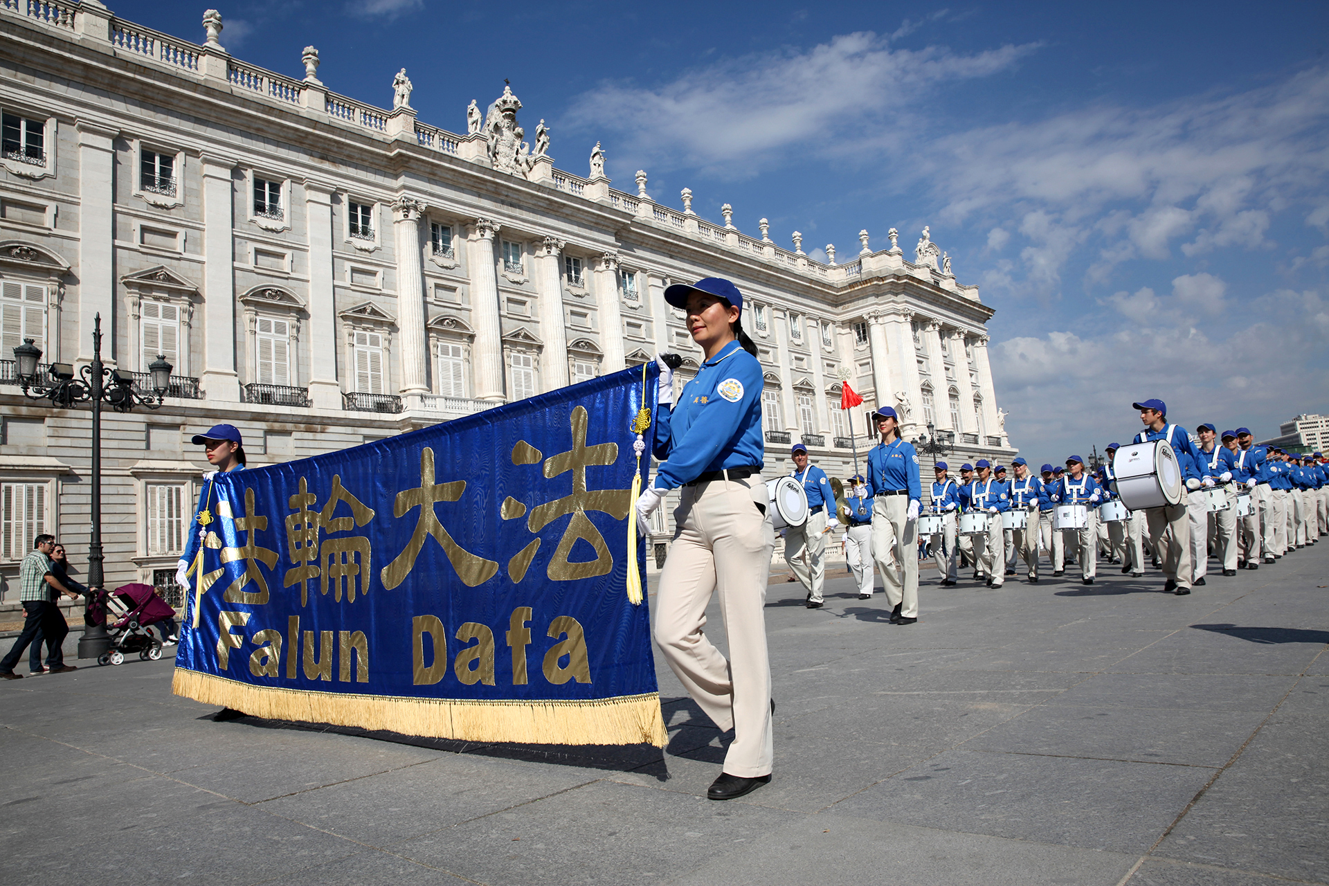 ![]() 图2:二零一四年十月四日欧洲法会期间,西班牙马德里游行队伍中的天国乐团 |