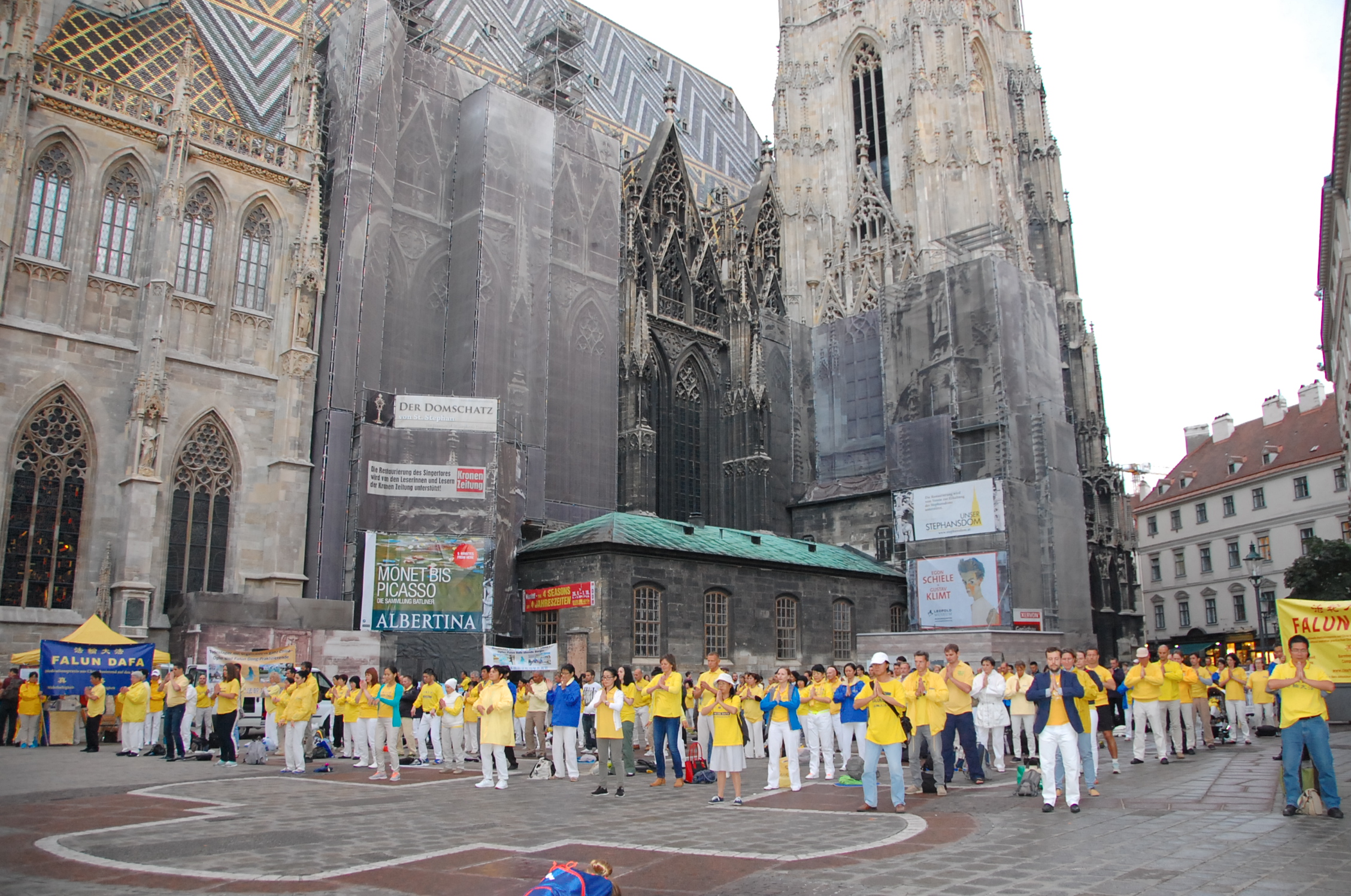 九月十八日晚六点半,欧洲法轮功学员在维也纳最著名的旅游景点,也是维也纳地标性建筑斯蒂芬大教堂旁的斯蒂芬广场(Stephansplatz)举行烛光守夜和集体炼功,声援诉江大潮。并向来自世界各地的游客和当地民众揭露中共残酷迫害法轮功学员的暴行,和中共活体摘取法轮功学员器官的反人类罪行。