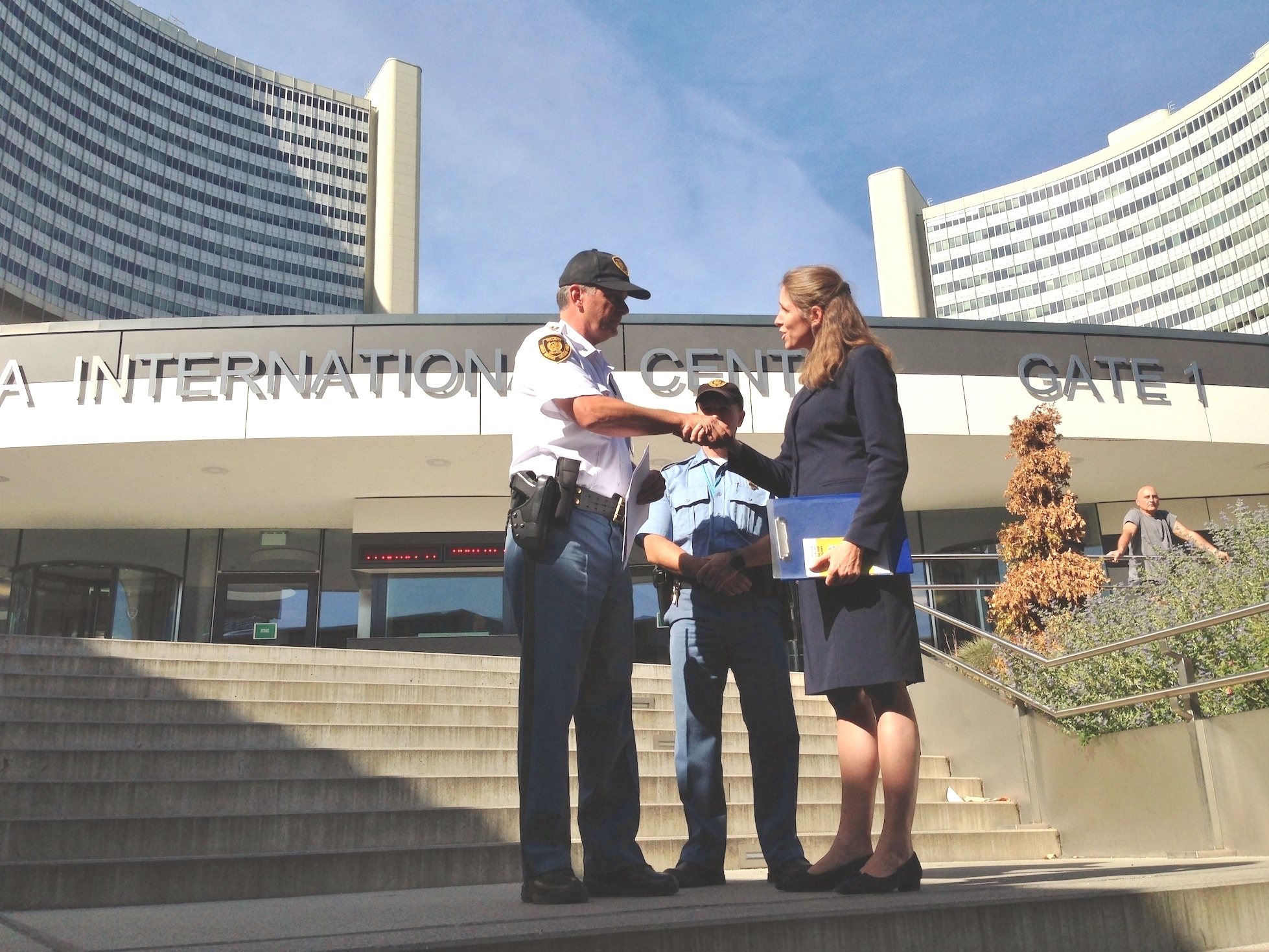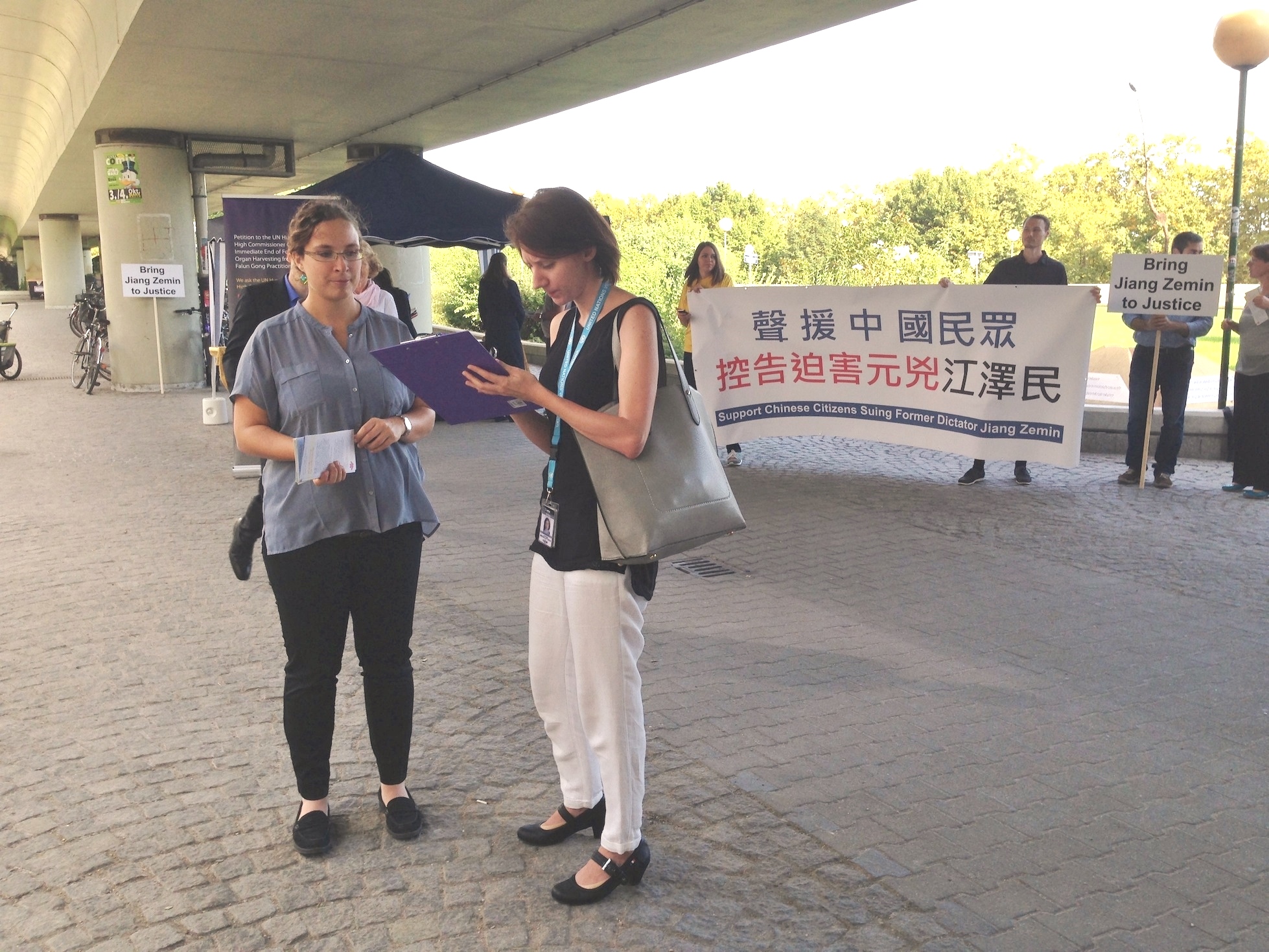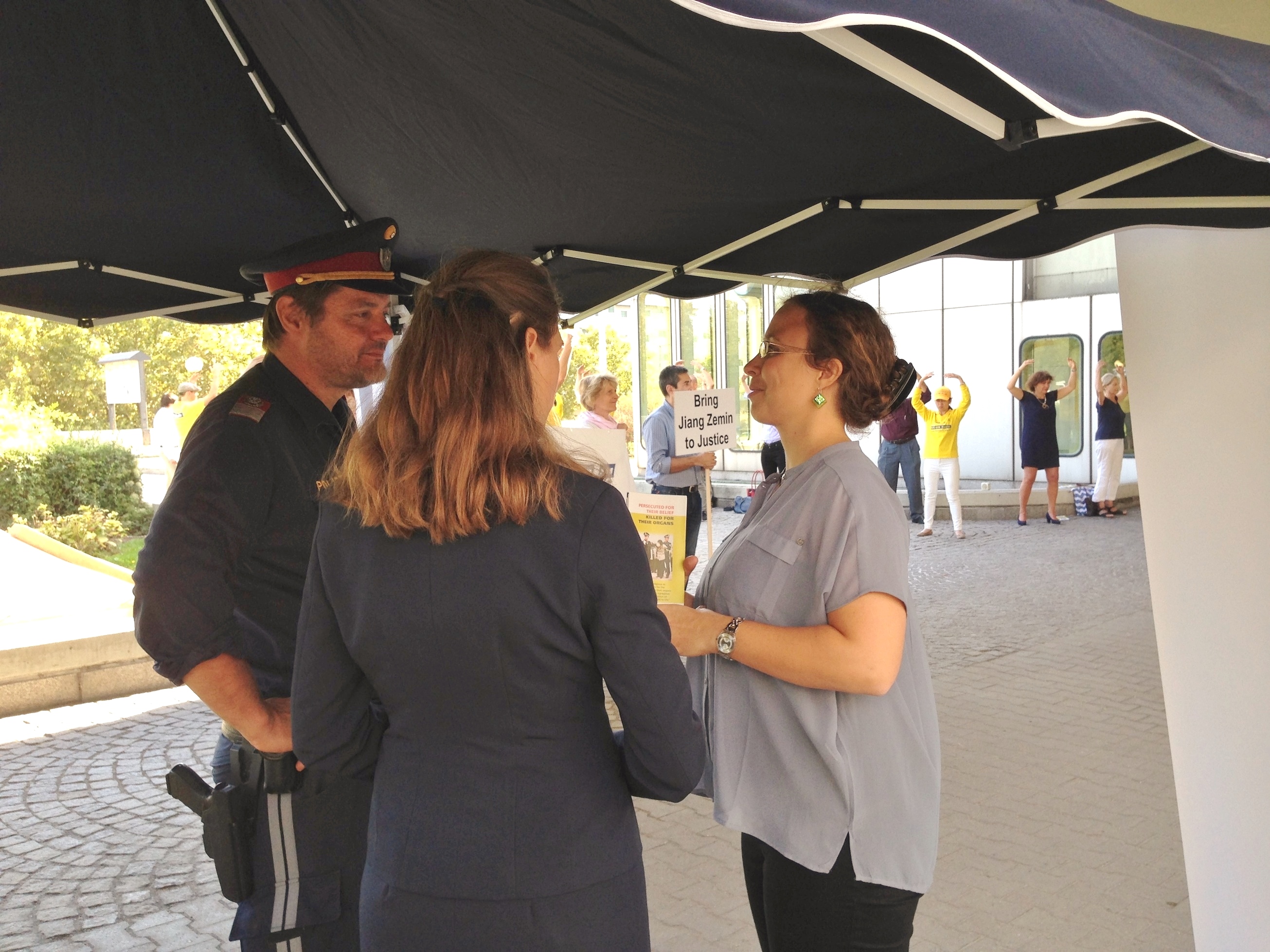 在活动过程中有位在大厦外执勤的联合国保安人员主动找到法轮功学员,问是否愿意把法轮功学员大力支持的谴责活摘的请愿征签正式交到联合国大厦里面去,随后,维也纳联合国大厦当天的安全负责官员(security inspector on duty)来到大厦前正式接受法轮功学员卡佳(Katja)面对面讲述中共迫害法轮功真相,并递出有关中共活摘罪行的真相资料和“医生反强摘器官国际组织”的请愿诉求。该位安全负责官员许诺要把这些资料寄给位于纽约的联合国总部。