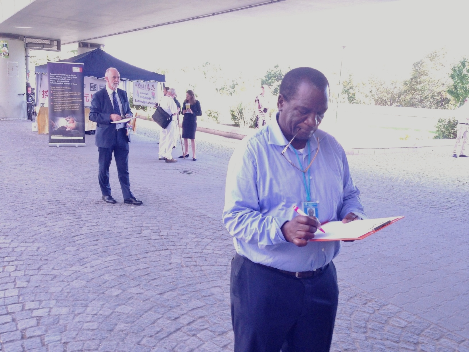 ![]() 图10:在联合国做有关人权工作的苏卡伊(Sewkaei)先生在签名谴责中共活摘罪恶 |