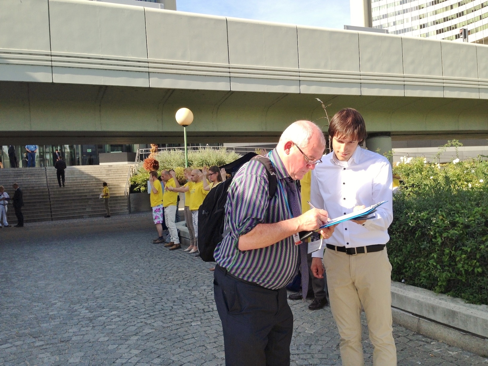 在维也纳联合国大厦外,法轮功学员打出横幅,竖起展板传达重要的真相信息、有人演示法轮功五套功法、有人发放法轮功真相传单并面对面讲真相、有人征签谴责中共活摘法轮功学员器官的罪恶。横幅和展板上用中、德、英文书写的信息是:“世界需要真善忍”、“声援中国民众控告迫害元凶江泽民”、“Bring Jiang Zemin to justice” ,以及向联合国提交的谴责中共活摘器官罪行的三大请愿诉求。