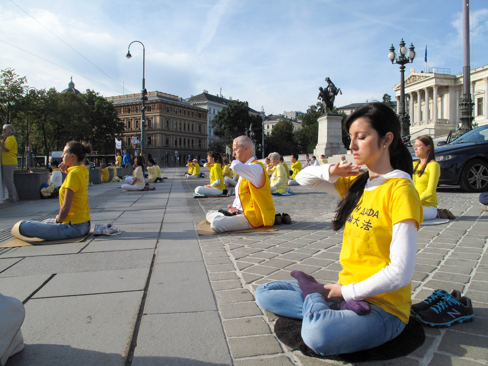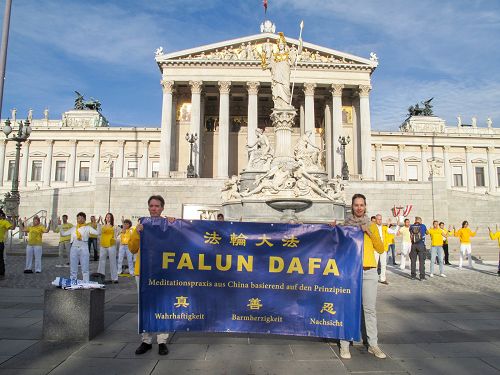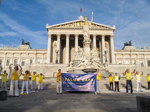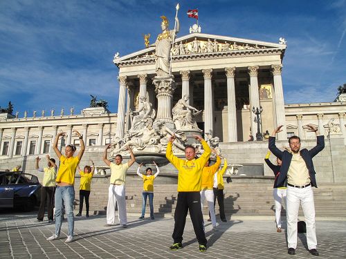 ![]() 二零一五年九月十九日星期六,部分欧洲法轮功学员在奥地利国会大厦(The Austrian Parliament)前集体炼功 |