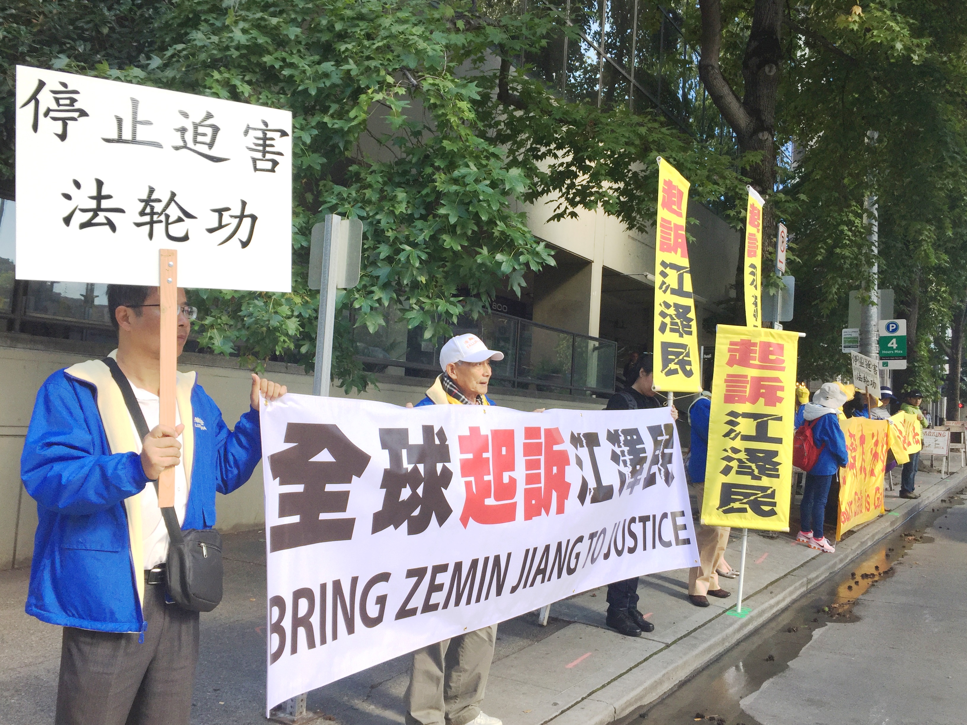 习近平入住的酒店位于西雅图市中心,周围是繁华的商业区,街道上人来人往。许多路人经过时好奇询问,学员告诉他们真相后,他们纷纷表示支持,并表示回去后会更深入了解法轮功。