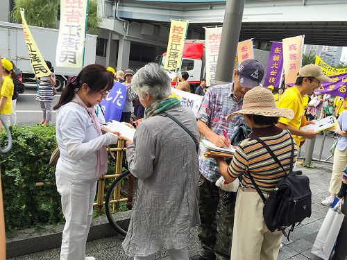 有位日本女士边签名边说:“我知道法轮功,在中国被迫害的很严重,我支持你们,要加油哦!”有几位在车站等车的日本人看着游行队伍的控江横幅,接过真相传单看了之后二话没说拿笔就签名。