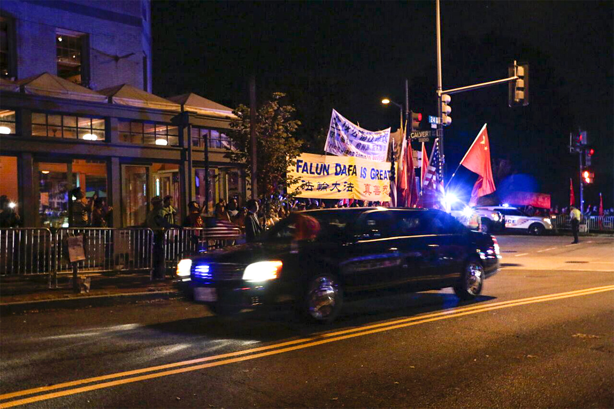 星期四傍晚六点多,习近平的车队抵达他们入住的华德曼公园万豪酒店,大华府地区的部分法轮功学员在出入这家酒店必经的道路两旁打出“法轮大法好”,“法办江泽民”等中英文横幅。当车队经过“法办江泽民”横幅时,坐在车里的人透过车窗都盯着横幅看。