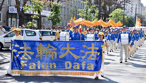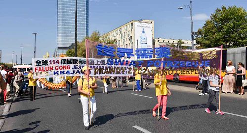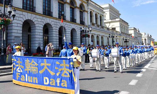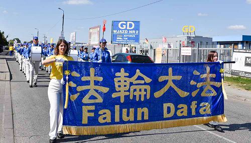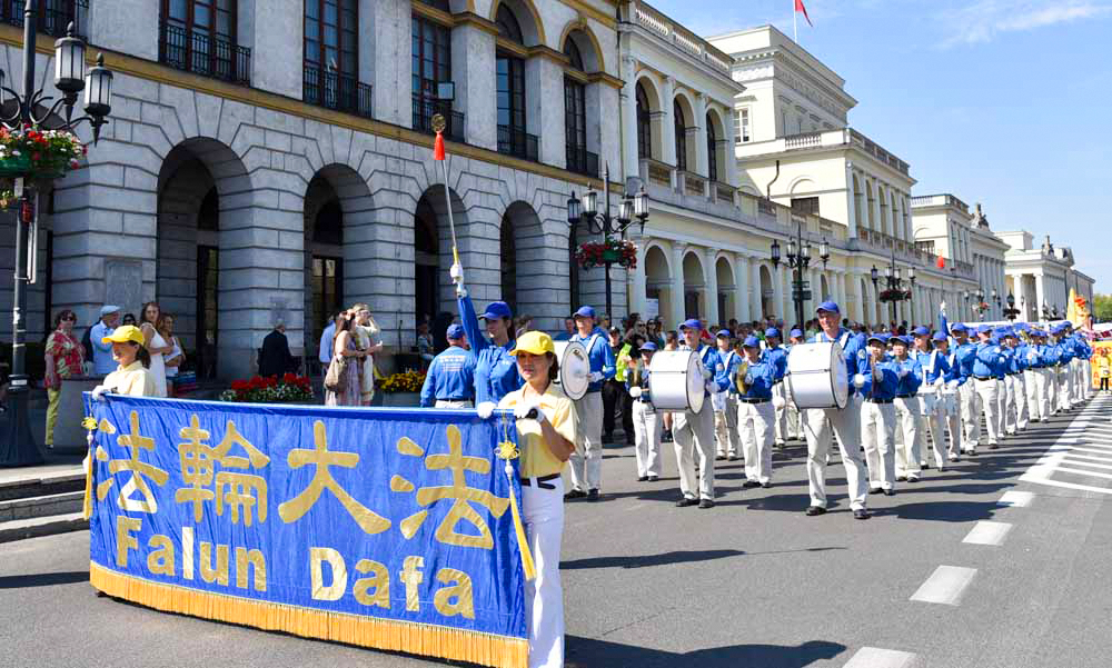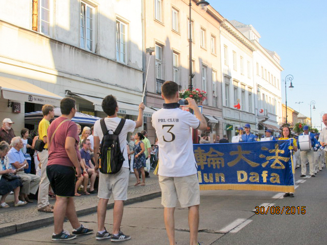 法轮大法游行队伍所到之处受到波兰民众赞叹和欢迎,特别是天国乐团的演奏震撼和洗涤着人们的心灵,相机、手机和掌声一直伴随着游行队伍的始末。天国乐团带给波兰民众的乐曲有《法轮圣王》、《法轮大法好》、《送宝》、《法正乾坤》、《凯旋》等等,很多人随着鼓声响起,笑容自然从心中流淌出来,还有很多人追着法轮功学员只为要一份法轮功真相传单,更多的人惊赞:法轮大法军乐团太棒了!