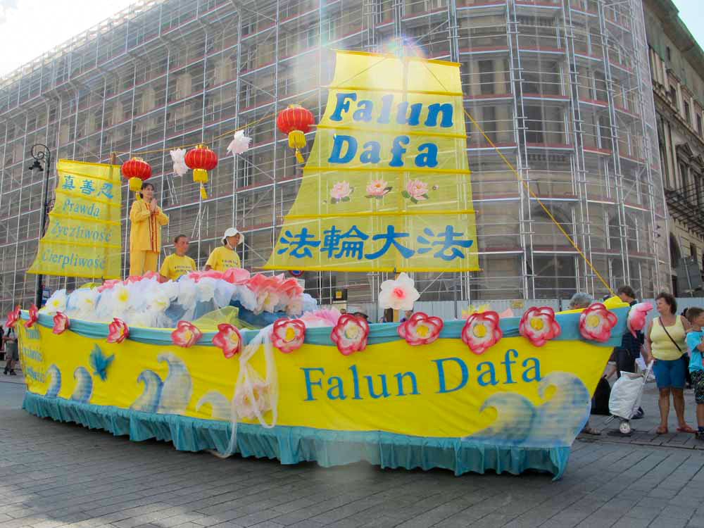 今年专程前来参加华沙多元文化节的还有来自欧洲的天国乐团,他们构成法轮大法游行的第一方队,第二方队是波兰法轮功学员组成的舞龙队,第三方队是一只带有“真善忍”风帆的彩船及手持“法轮大法在波兰”及“世界需要真善忍”等条幅的法轮功队伍。