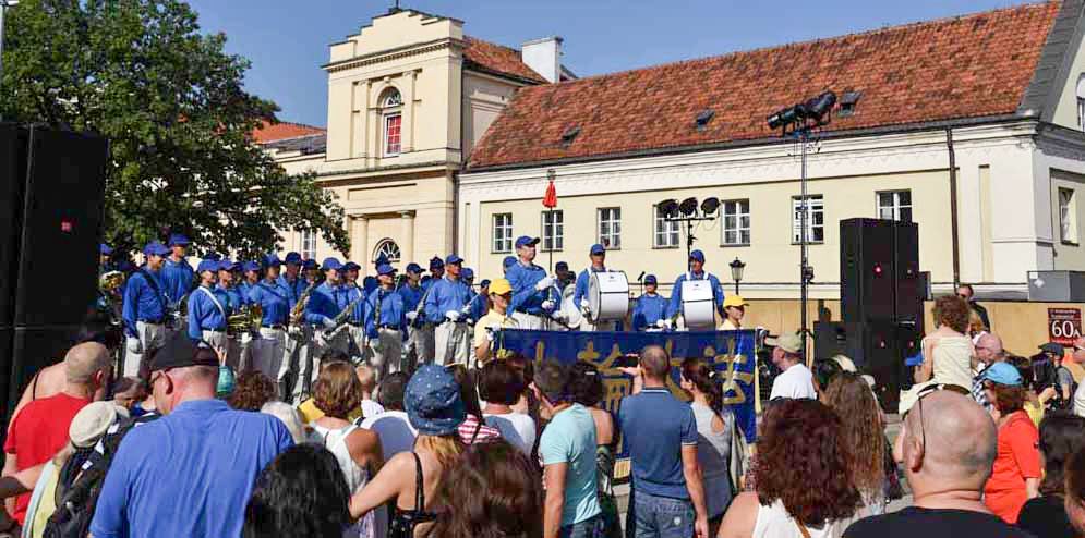 天国乐团在结束中国商业城弘法后又来到华沙市中心的老城,为众多的游客们演奏法轮大法天音,受到热烈的欢迎。