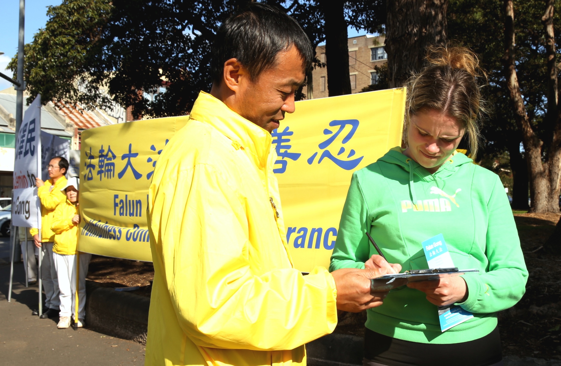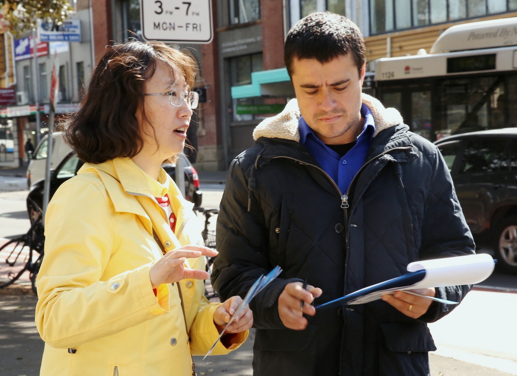 一位年轻姑娘在发真相资料的法轮功学员面前停了下来,接过征签板在表格上签了名。她告诉那位学员,她已经知道了法轮功被迫害的真相,这样的事情完全不应该发生。