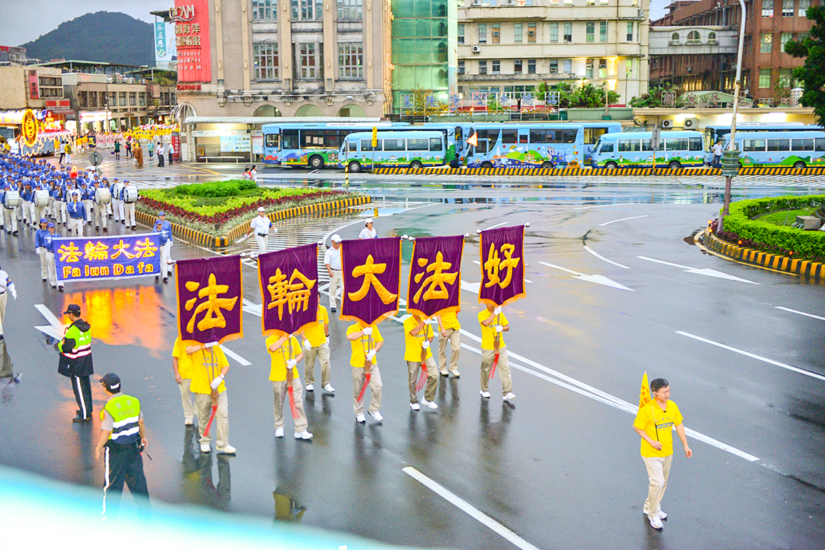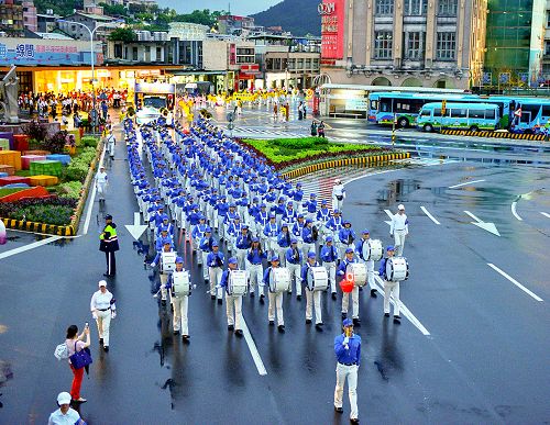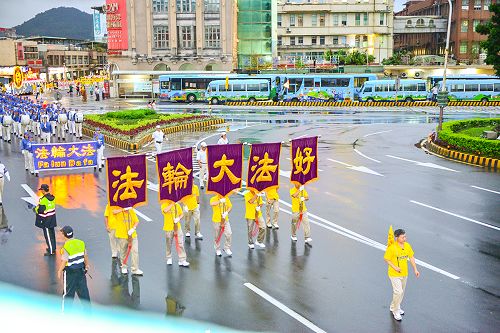 二零零八年的游行中,下起了大雨,其它的游行队伍纷纷躲雨,场面变得零零落落的,然而数百人的法轮大法队伍,齐刷刷地在雨中展示功法,优美的功法乐音与庄严的场面,让现场民众难忘那一幕,心中也铭记法轮大法好!真善忍好!那一年,法轮大法队伍获基隆市政府颁发的最佳团体精神奖与优等奖。二零零九年到二零一二年,还有二零一四年,法轮大法队伍都获得最佳团体精神奖、甲等奖。二零一三年,法轮功学员没参加游行,许多民众遇到学员,一直关心地问,怎么没看到你们呢?