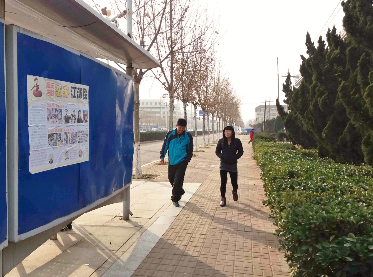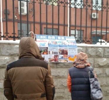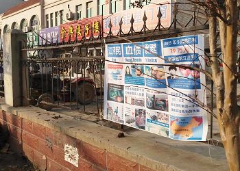 这是在唐山一县城小学城墙上的诉江展板,在上下学高峰期有很多家长和学生围观。
