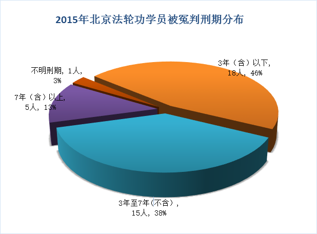 2015年北京法轮功学员被非法冤判刑期最短为6个月,最长8年。其中,3年(含)以下18人,占总人数的46%;3年至7年(不含)15人,占总人数的38%;7年(含)以上为5人,占总人数的123%;不明刑期1人。