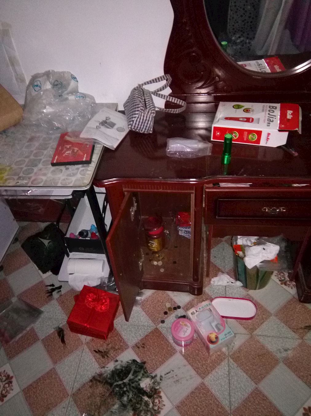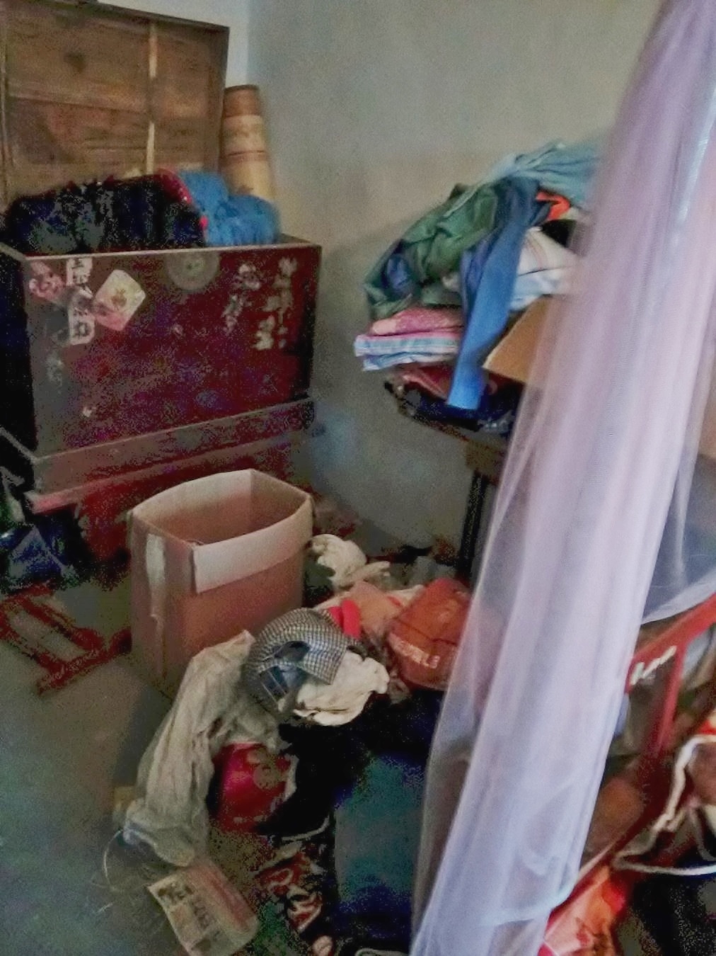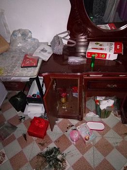 附录:警察在孟祥兰家抄走一部台式电脑和一个笔记本电脑、两部手机、一箱真相期刊、三箱真相光碟、一箱309胶、三本《转法轮》、一套大法书、一张师父法像,还有若干真相展板、真相不干胶,及其它私人财物。在孟祥玲家,非法抄走了三台笔记本电脑、两台打印机、一套大法书、两部手机、若干真相期刊、打印耗材、若干真相展板、真相不干胶、真相光盘、优盘两个,mp5、mp3、车挂、护身符和破网软件等私人财物,并把她们家翻得一片狼藉,给两个家造成损失价值三万多元。下图为警察抄家后的场景。