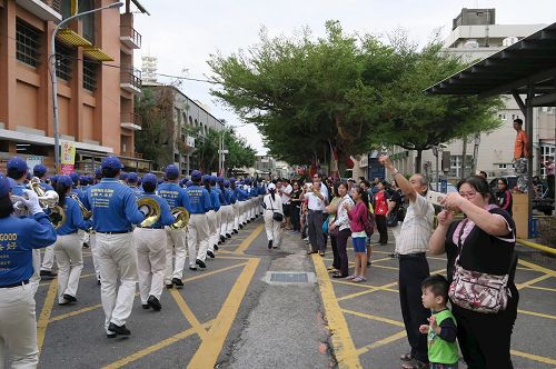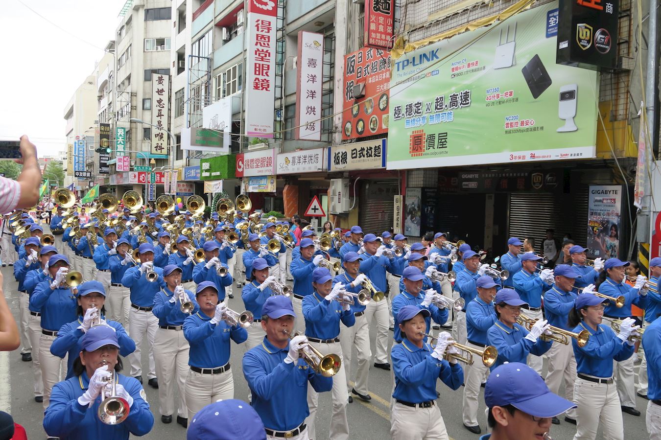 彰化县政府主办的双十游行活动,邀请天国乐团作为开道引领,带领二十几个学校的行进乐队游行表演。街道两侧聚集众多民众,纷纷拍照、录影、合影,将这难得一见的画面记录下来。