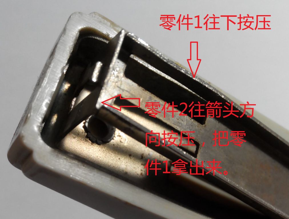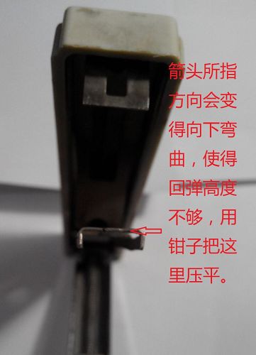 转头小订书机,由于订太厚的资料使用不当不好使了,现象是压下书钉后不回弹,订书机的头起不来,需要往外拉一下才能订第二颗书钉。拆开订书机发现,压钉的铁片中间的定位零件头部变形,导致回弹位置比正常的低,没法装订了。解决方法就是将铁片和定位头分离,用钳子压平就行了。调整方法见图示。