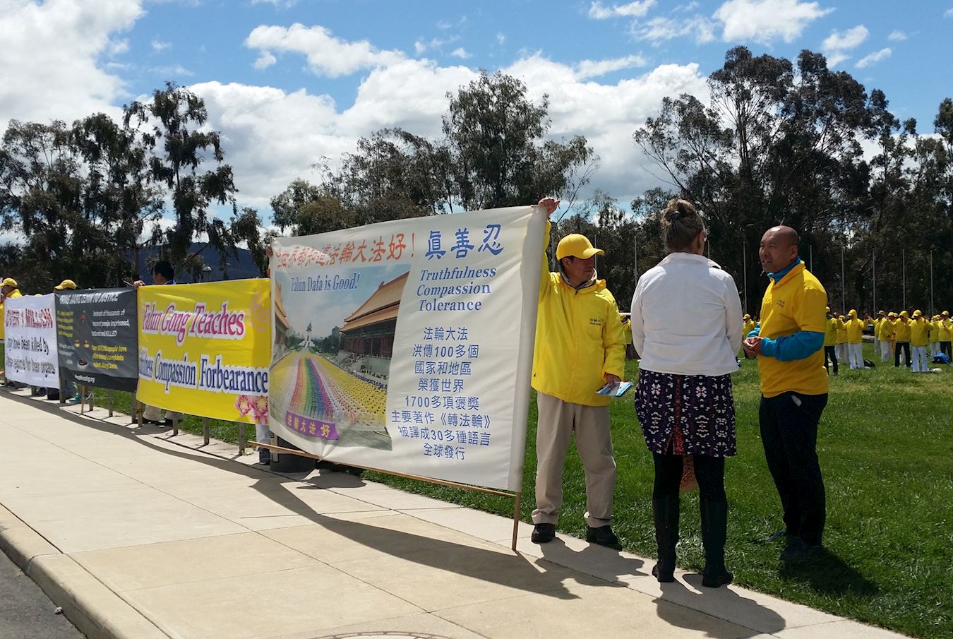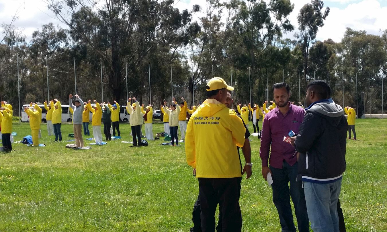 十月十日清晨,一部份法轮功学员在堪培拉花节的举办地,展示法轮大法功法,花节保安约翰深受感动,他说:“你们炼功的能量给我非常美好的感受,服装的颜色也很漂亮。我忍不住给媒体打了电话,叫他们来拍照、报道。”在国会工作的格蕾丝女士对学员说:“我来上班的路上看到你们拉着横幅抗议,同时展示功法,你们做的非常好,我支持你们。”