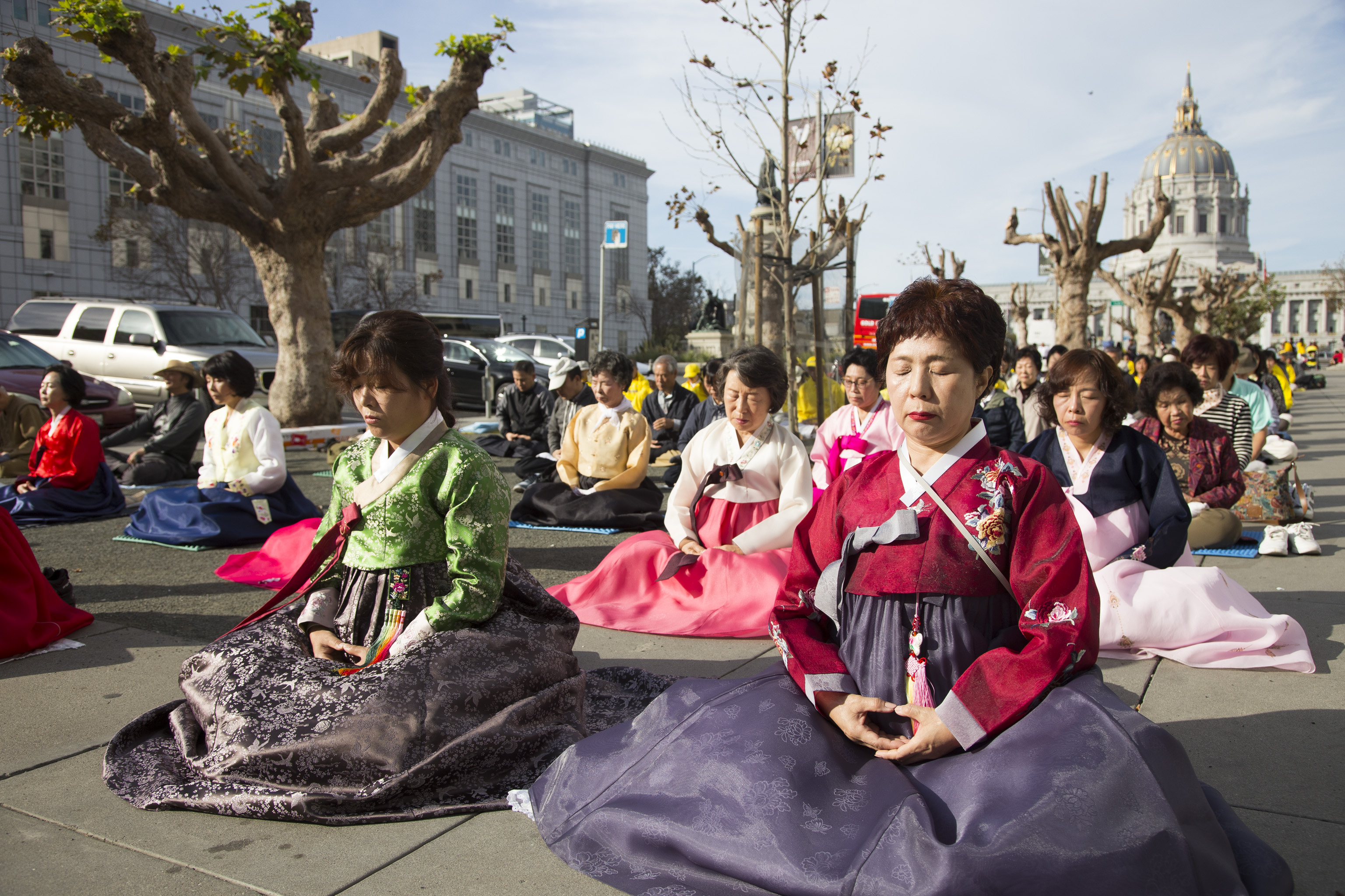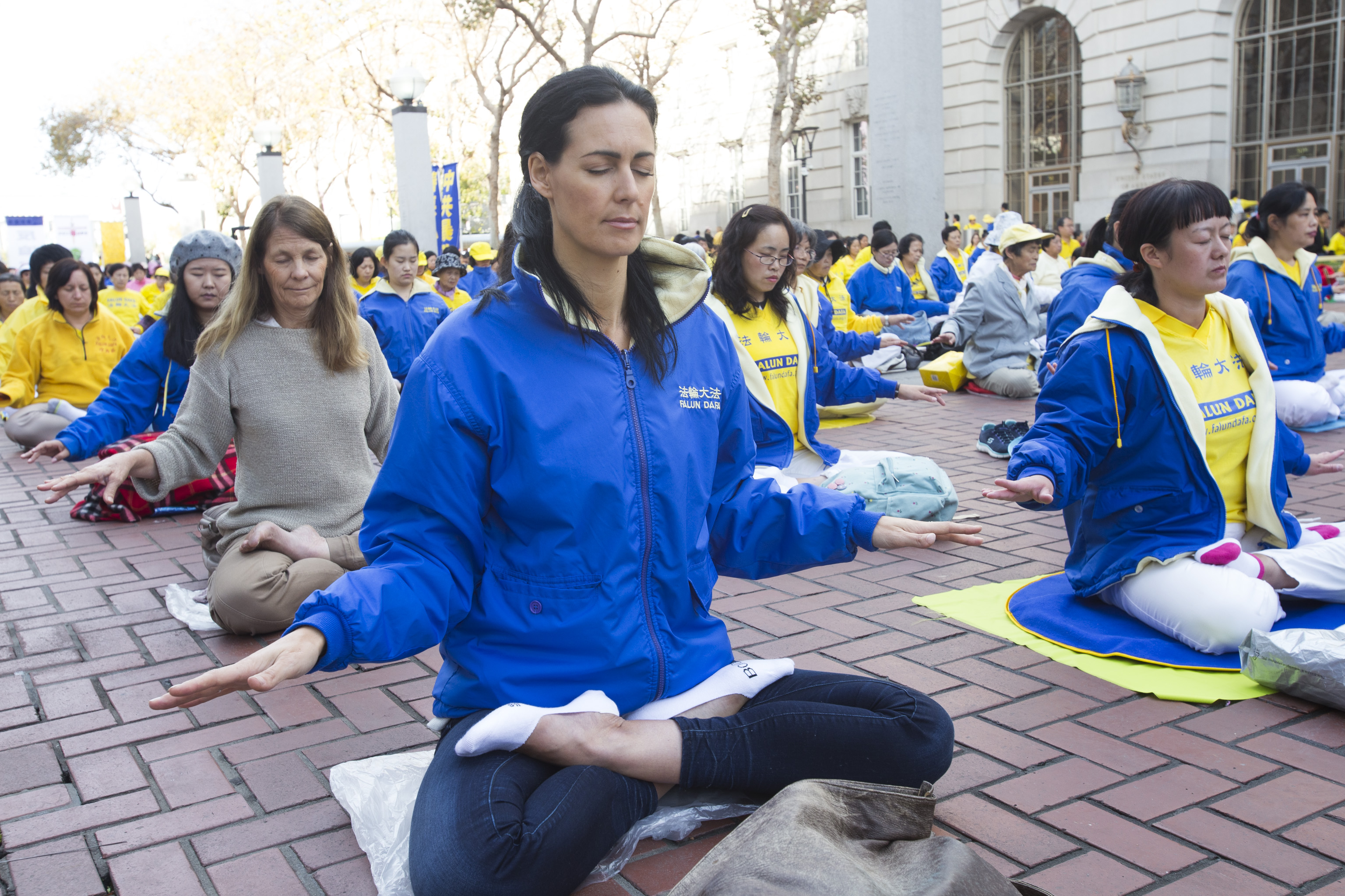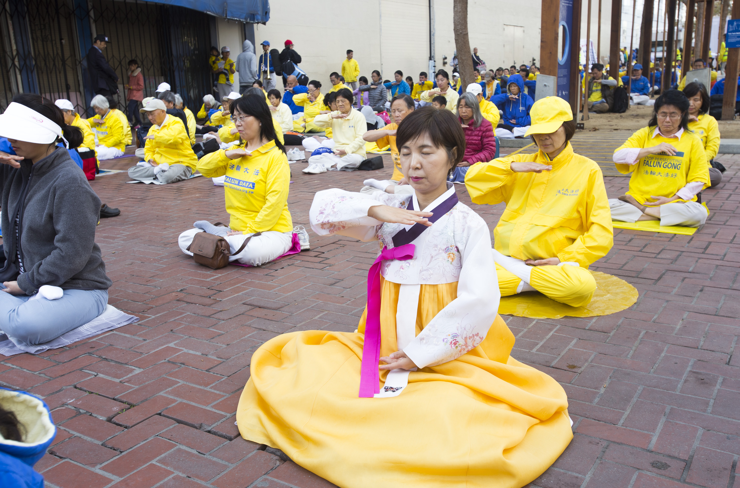 图1-4:二零一六年十月二十二日上午,约三千各族裔法轮功学员在旧金山联合国广场集体炼功,过往路人感受祥和。