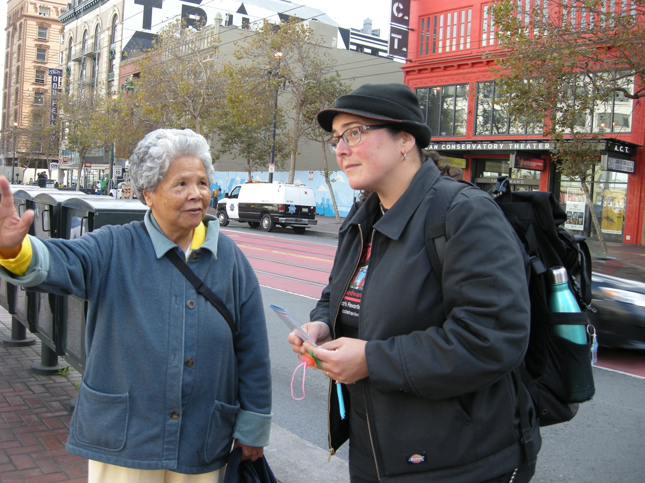 ![]() 图12:今年八十岁的李景容(左)是修炼法轮功一年多的新学员,游行中给西人讲真相。 |