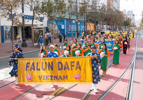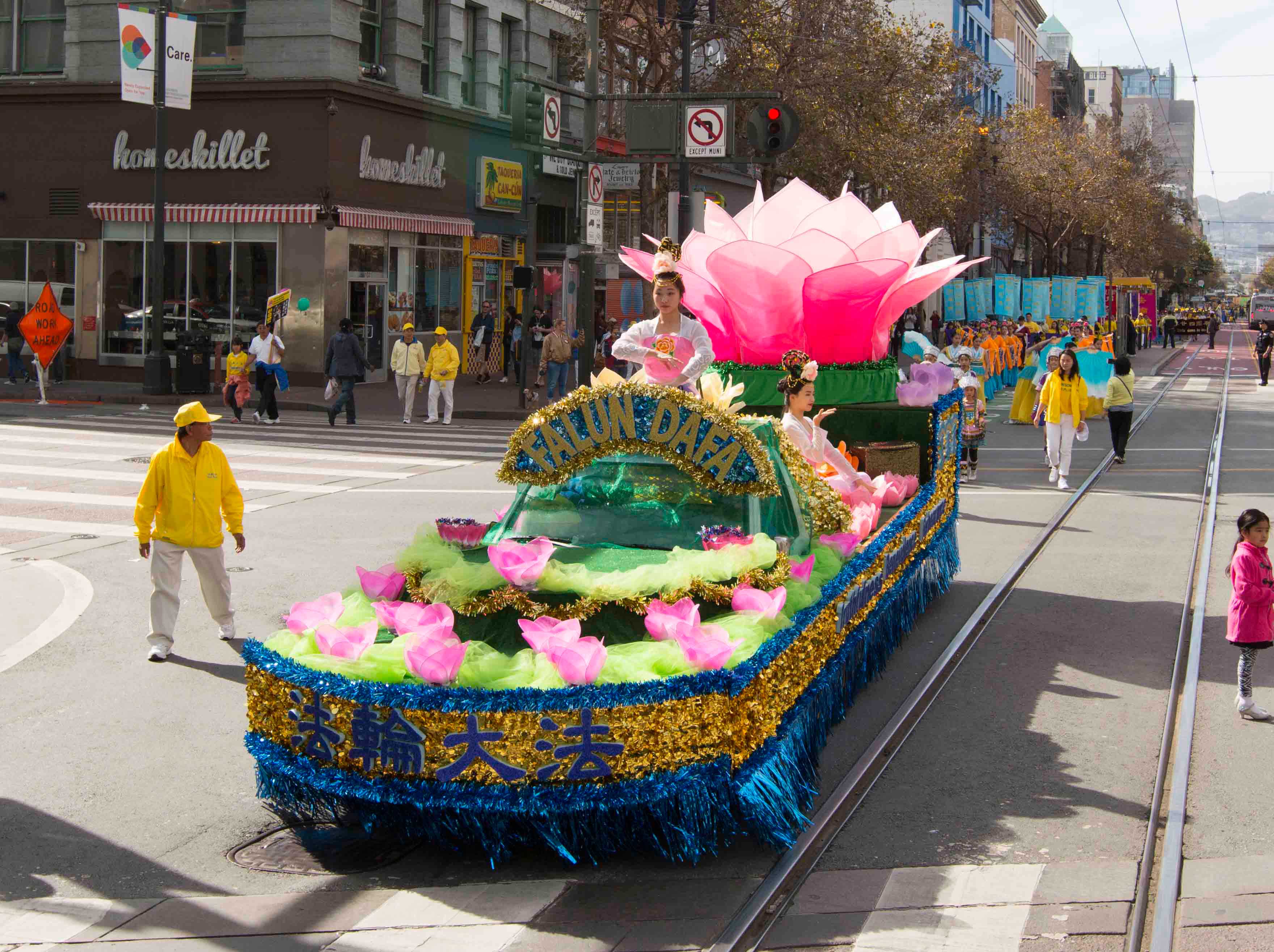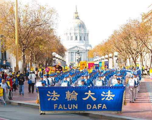 游行包括五大方阵: 第一方阵:天国乐团;第二方阵:法轮大法好;第三方阵:停止迫害法轮功;第四方阵:声援二亿五千多万中华儿女退出中共。历时三小时的游行向旧金山主流人士和华人展示大法的美好,揭露中共十七年来对法轮功学员的残酷迫害,赢得民众的正义支持。