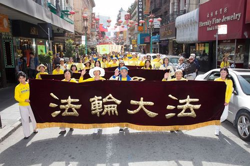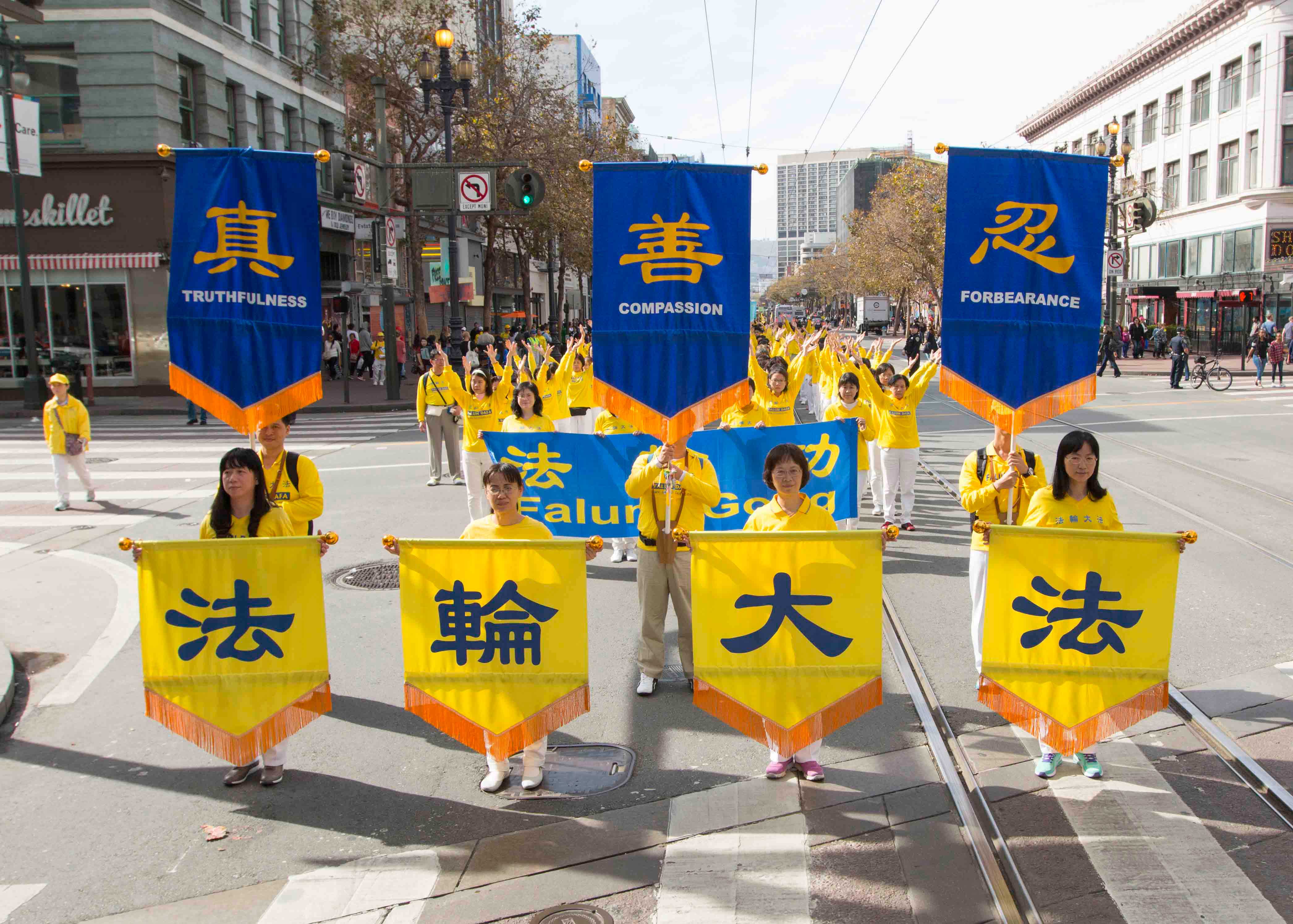 上午十一点三十分至下午二点三十分,约四千名法轮功学员在旧金山的联合国广场 (UN Plaza) 集合,开始大游行。队伍从联合国广场出发,沿Market街,往北途经市中心联合广场(Union Square) 的商业和购物区,以及中国城的主要街道,到花园角公园结束。