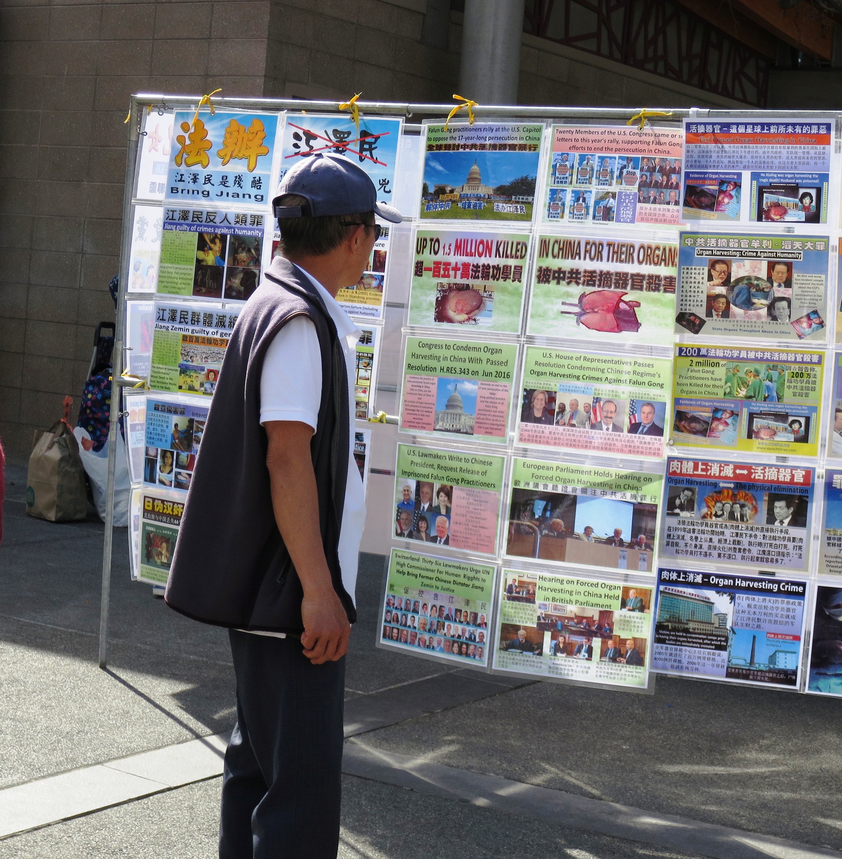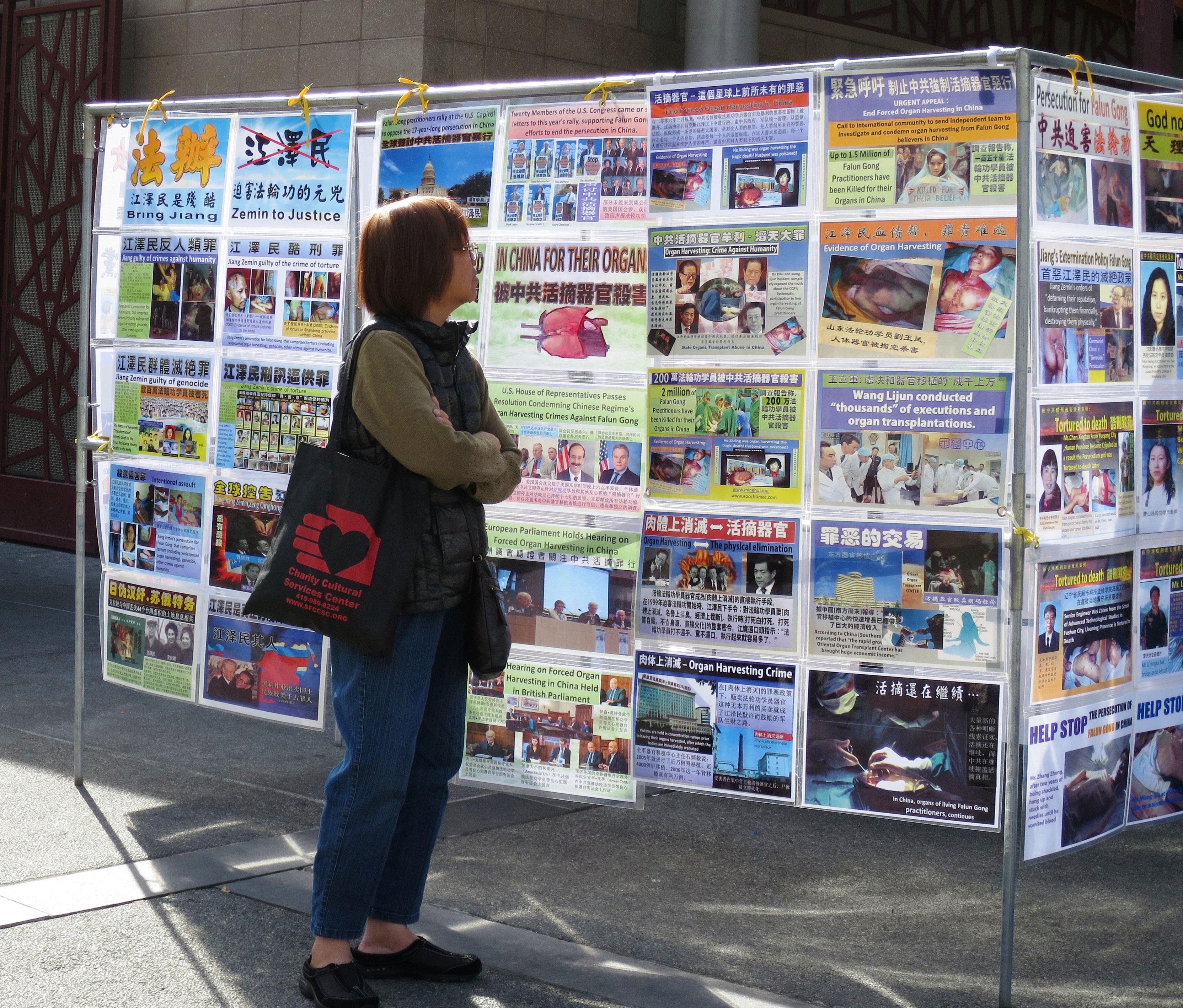 花园角广场(Portsmouth Square)是唐人街一个非常活跃的地方,这里有各种活动,如打太极拳、下棋、打牌和吹拉弹唱等,是很多老年华人喜欢聚集的地方。由于这里的华人跟中国大陆有着千丝万缕的联系,不少华人对法轮功的态度深受中共谎言影响。为此,一些法轮功学员常年坚持在此炼功并讲述法轮功的美好和中共迫害的真相。他们在那里挂放图片展,内容包括介绍法轮大法弘传世界、中共迫害法轮功学员、打压修炼“真、善、忍”的中国民众,以及揭露中共活体摘取法轮功学员器官等罪行。