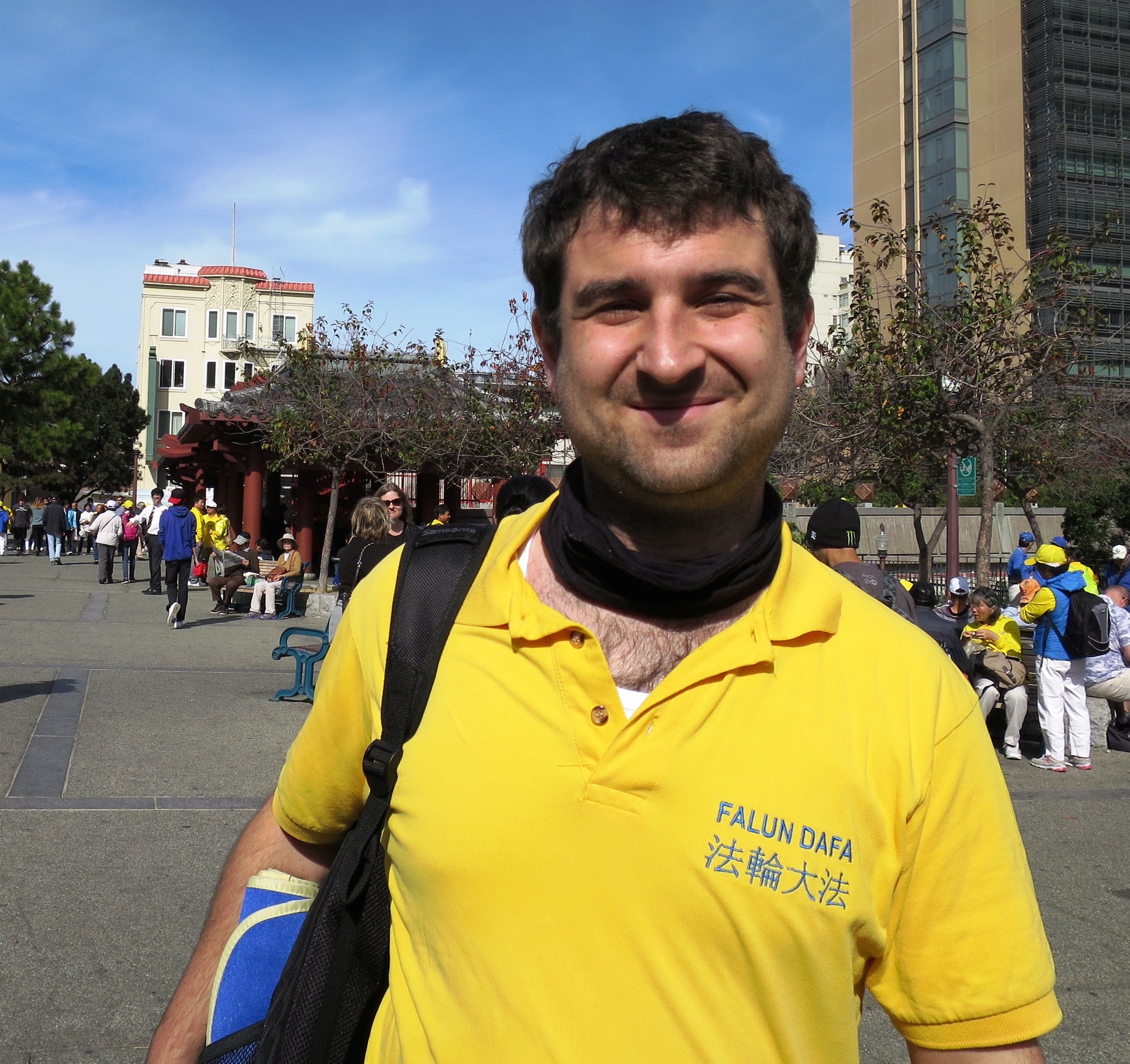 来自德国的法轮功学员Jens Meding两年前也到过花园角,那次他看到许多在场的华人看到法轮功学员集体炼功时,有的表情麻木,他苦于自己只会说几句简单中文,而无法进一步详细地跟那些华人讲法轮功的真相,那时候他又着急又难过。