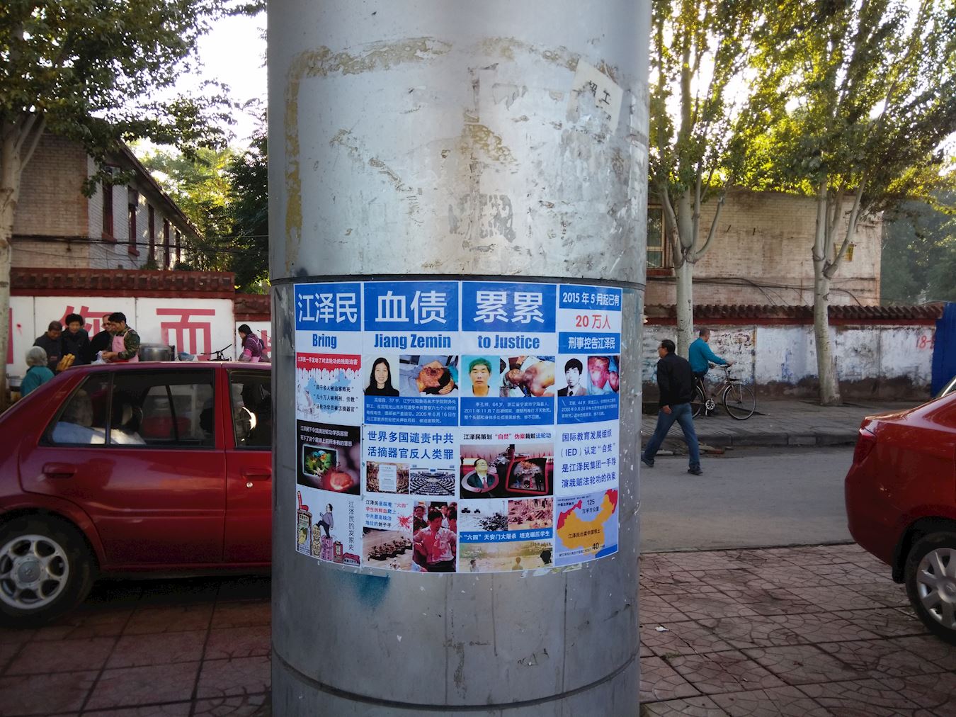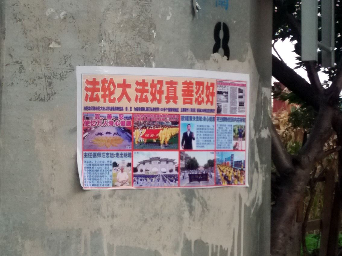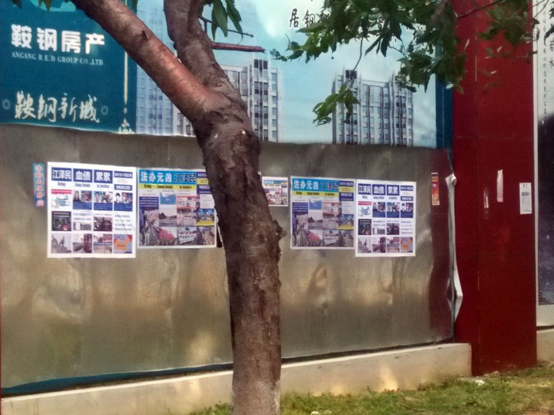 鞍山市“十一”期间真相展板、法轮大法好不干胶及条幅遍布大街小巷,市民纷纷观看,了解法轮功真相,在鞍山市某地还出现了五米长的真相展板,图文并茂讲述4.25上访真相,法轮大法洪传世界、法办江泽民、活摘器官等信息,吸引众多的市民前来观看。