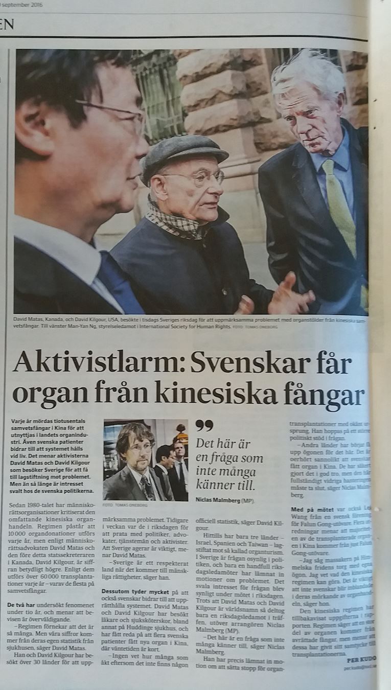 《瑞典日报》(SVD)以醒目的标题提醒瑞典民众不应接受中国良心犯的器官。报道指出,在中国的器官产业界,每年都有几万无辜的良心犯被杀害,他们的器官被活摘盗取贩卖。甚至很多瑞典病人依靠这套系统赖以生存,但是瑞典的政治家们却因为利益对此犯罪保持沉默。