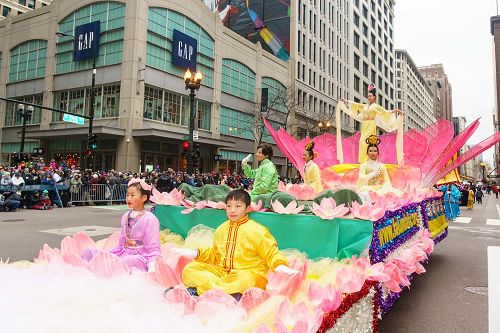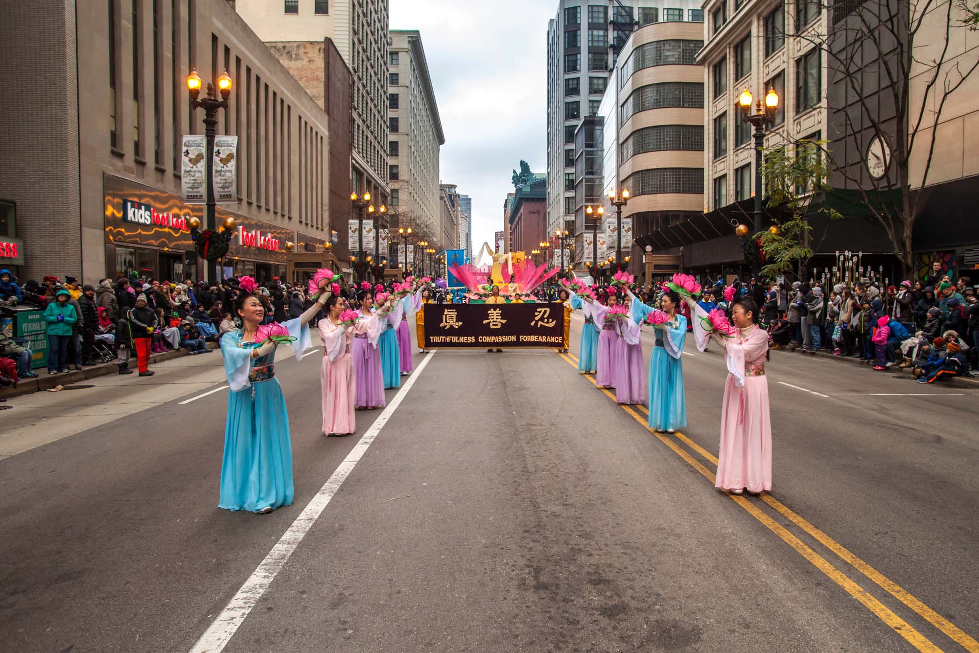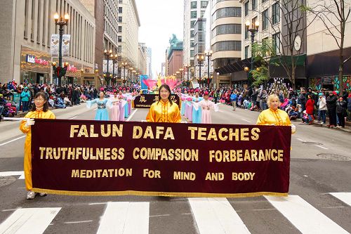 法轮功学员连续十几年应组委会邀请参加游行,今年排在第十位,走在游行的前列。他们富有东方韵味的优美表演和传递的“真、善、忍”信息受到观众的热烈欢迎。