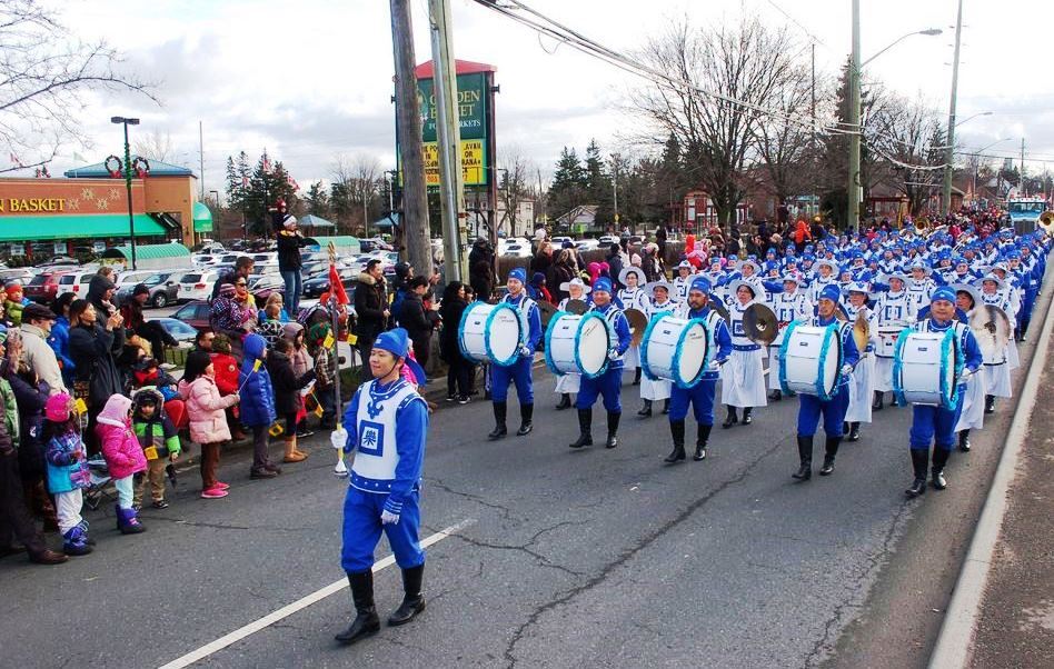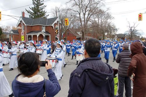 这是由法轮功学员组成的多伦多天国乐团参加北边的Markham(万锦市)圣诞大游行时出现的一幕。这对夫妇俩是来自沈阳的摄影爱好者,太太一边拍照一边说:“法轮功在海外可以这么自由展现他们的美好,其实在国内现在也越来越多人明白了(法轮功真相),相信形势会越来越好的。那古装真好看,法轮功好就好在一直在弘扬中国的传统文化。”她的先生一边录像一边竖着大拇指表示赞赏。