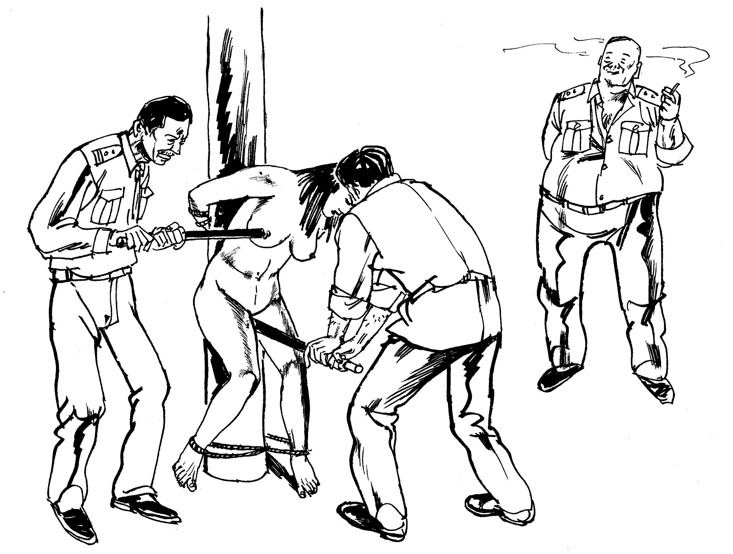 他们又将我带走,其中一警察说:“这娘们儿劳教过,给她整房顶上吊起来。”他们把我双手背铐,手腕上缠上湿毛巾,用绳子将我双脚捆绑拴在铁椅子上,先将手铐挂在上下铺的上铺床的铁筋上,身体悬空,重心集中在手腕上。他们开始毫无人性的推动我的身体悠来悠去,另一警察坐在床上使劲晃动床。其中一警察极其阴险的说:“把电棍拿来,电她最敏感部位。”另一警察极为下流的说:“哪敏感?就××地方敏感”。他们取来电棍虽未电击下身,但疯狂电击我的双乳,将我从床上放下后又将我放在铁椅子上。叫嚣:“你说吧,不说还挂,你是不是去北京了?挂条幅了?”