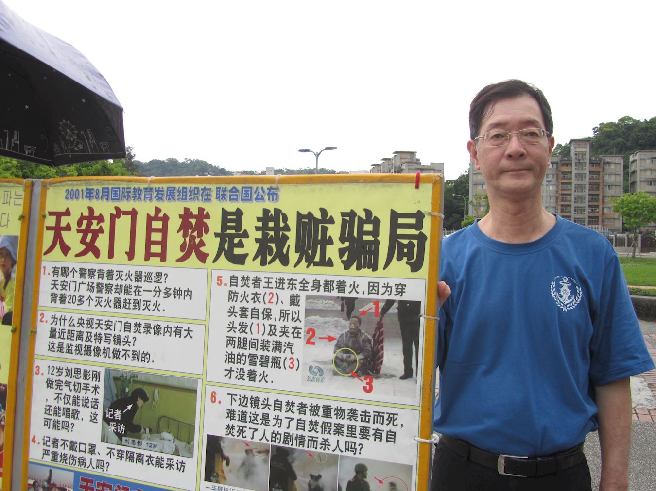 【明慧网二零一六年十二月十七日】(明慧记者郑语焉台湾台北采访报道)北台湾著名景点“士林官邸”,每天无论晴雨都能看到法轮功学员祥和可掬的身影,他们自发自愿地在景点附近摆展板、发资料、讲真相。董国强是其中一位,他固定每周几个时段来到士林官邸,无论严寒酷暑,任它风吹日晒甚至雨淋,在景点一待就是半天,甚至更长时间。