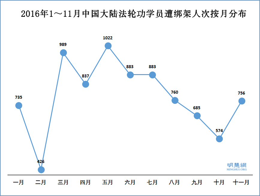 2016年1~11月中国大陆法轮功学员遭绑架人次按月分布