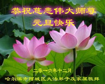 【明慧网二零一六年十二月二十九日】新年到,黑龙江哈尔滨市双城区大法弟子家人和亲属给法轮功创始人李洪志师父发来录音贺词,感恩师父!祝师父新年快乐!他们在录音中表示,感谢大法给了家人和自己健康的身体,感谢师父为全家带来幸福生活!希望对大法的这场邪恶迫害早日结束,盼望师父早日回国,使更多的中国人在大法中受益!