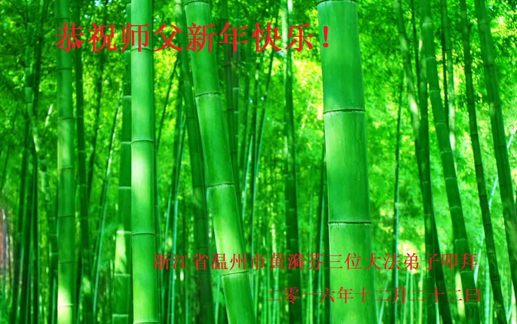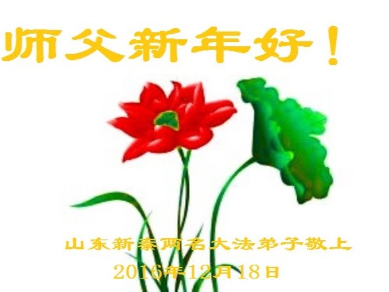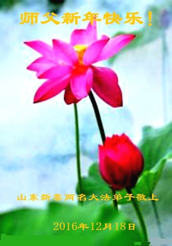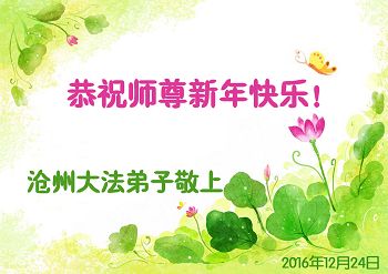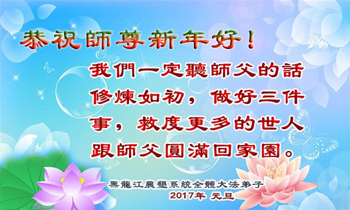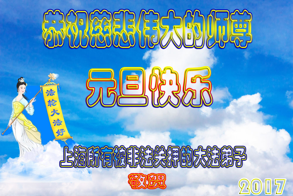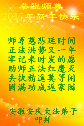 二零一七年即将来临,我向师尊问好!师尊辛苦了!我怀着无限崇敬的心情感恩师尊的苦度!中共邪党对修真、善、忍的法轮功学员实施了最严酷的史无前例的迫害。在迫害中我没有倒下。我在伟大慈悲师尊时时刻刻的呵护下,在风风雨雨中我已修炼了二十年了,我在兑现着正法时期大法弟子救度众生的誓约。在修炼过程中还有许多为名、利、情产生的人的心。请师尊放心,弟子听您的话,走您安排的路,多学法,学好法,遇事向内找,修好自己,做好大法弟子必须做的三件事。弟子盼望师尊早日回中国大陆!盼望神韵早日来中国大陆演出!