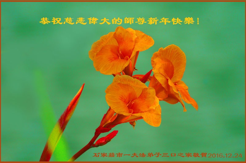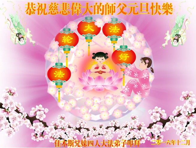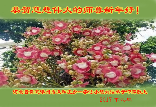 在二零一七年新年即将到来之际,我们怀着无限感恩的心情,向慈悲伟大的师尊致以新年的问候!师尊您好!师尊辛苦了!在新的一年里,在师尊以巨大的承受换来的宝贵时间里,弟子们决心多学法,静心学法,读懂法,用法来归正自己的一思一念、一言一行,时时事事向内找,去掉还未修去的人心、观念、执着,脚踏实地、踏踏实实做好三件事,多救世人,兑现自己的誓约,跟师父回家。叩拜师父!