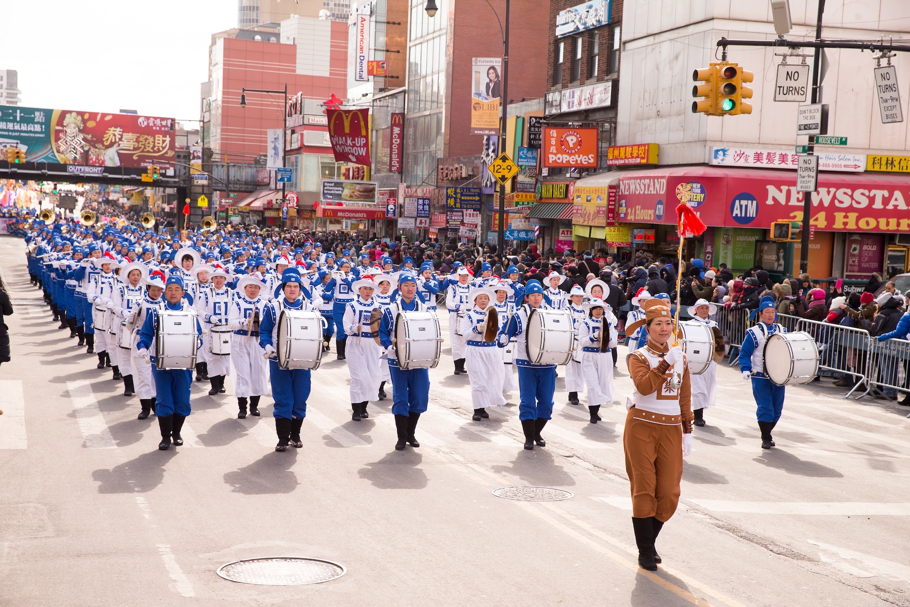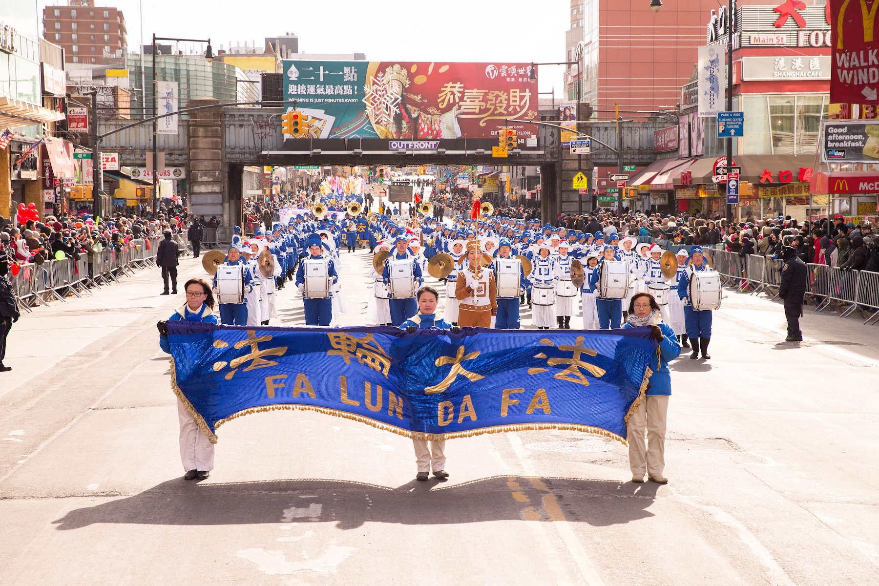 法拉盛新年游行中,法轮大法团体、全球退党服务中心如往年一样参加游行。他们阵容鼎盛,队伍整齐,有气势如虹的天国乐团、婀娜多姿的古风仙女、“凤船”花车、传统“中国风”的腰鼓队……,引人瞩目的亮点一个接一个,使他们再度成为游行最亮丽的队伍,民众赞不绝口,纷纷说:“法轮功队伍最壮观。”