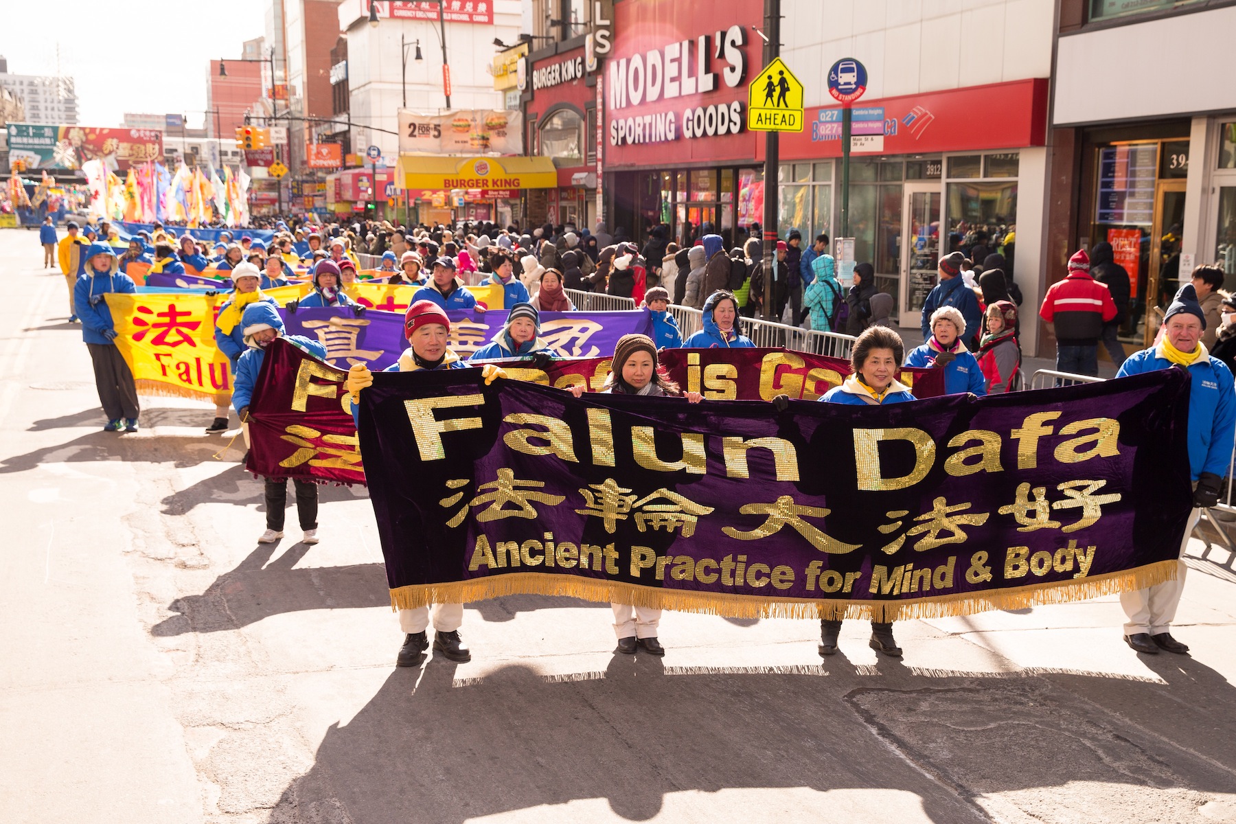 中外法轮功学员,手持五彩缤纷的“法轮大法好”、“真善忍”横幅和彩旗,沿途向民众送上新年的祝福,送上法轮大法的福音;法轮功团体参加法拉盛新年游行已超过十年的法轮功队伍,每年都为中西族裔民众展现正统的中国传统文化,为法拉盛多元的文化增添亮丽的色彩。沿途不断有民众向法轮功学员挥手致意,有的跟着高呼“法轮大法好”。