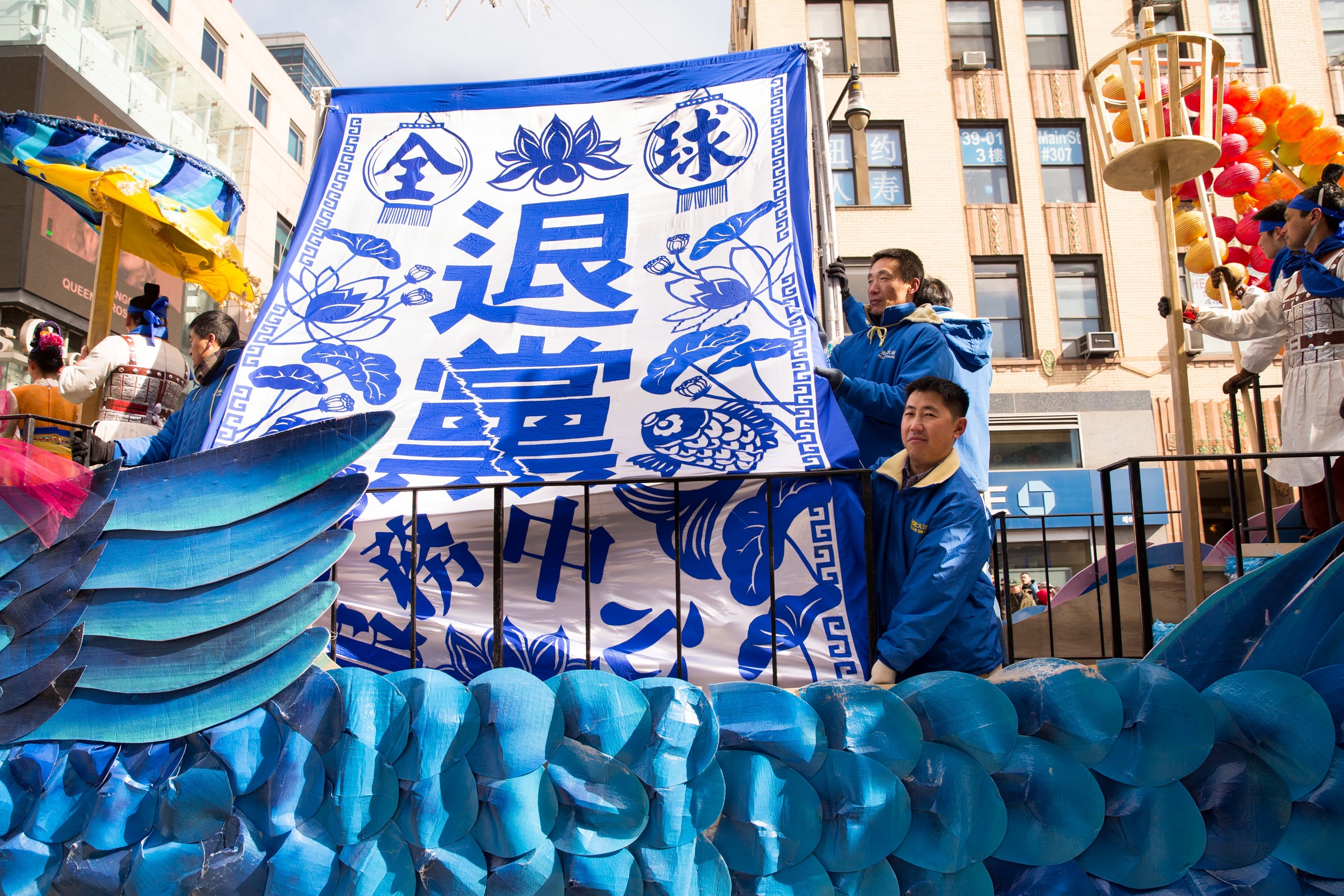 法轮功方阵后面是由中外族裔的全球退党义工组成的“三退顺天神灵护,九评进户福德随”退党中心方阵。彩狮、锣鼓,花车、横幅、彩旗、腰鼓等醒目的信息,为民众带来“除恶避凶辞旧岁,救人趋吉迎新春”的祝福。退党中心的花车设计别具匠心,是一艘翱翔的“宝蓝凤船”,分外亮眼。身着亮丽古代仕女服的年轻退党义工,展臂站于车上,如美丽的“宝蓝仙子”,车身两旁是“凤凰”翱翔的双翼。花车的设计者金先生是一名从事服装设计的法轮功学员,他介绍说,“凤凰”是天上的祥瑞之物,退党中心的花车装扮成“凤船”,寓意《九评》给中国人送来得救的福音,退党使中国人获得新生。