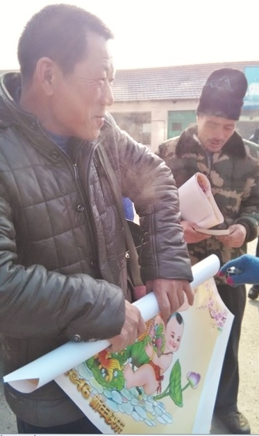 在一个商店门口,法轮功学员发明慧年画,正赶上一帮扭秧歌的老太太,人人都来要年画,真的抢了起来。有个人还拽着一个没“三退”的熟人不让走,让法轮功学员赶紧给记名三退。