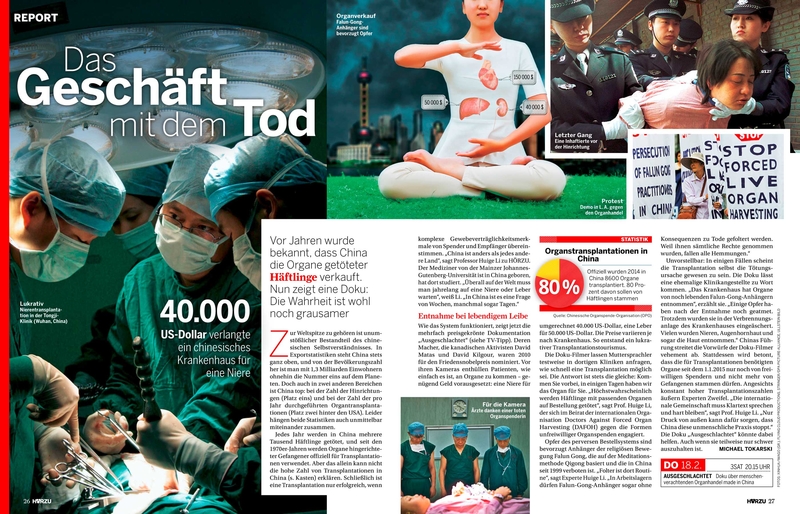 3SAT播出《活摘》纪录片前夕,德国最有影响力的电视广播节目周刊《听闻》(Hörzu)用了两个整版来预告,详细介绍了中国正在发生的活摘器官罪行和法轮功遭受迫害的背景。该杂志每周发行一百四十万份,大规模传播了《活摘》要表达的信息。