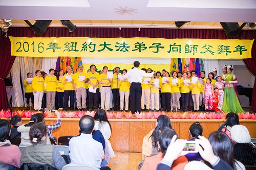 在金黄色莲花的环绕下,“师父新年好”的巨型条幅展示在会场中央,各族裔的法轮功学员,男女老少双手合十,感恩李洪志大师的慈悲苦度,并恭祝李洪志大师新年好,他们以最虔敬和感恩的心连声祝颂“师父新年好!法轮大法好!”