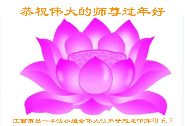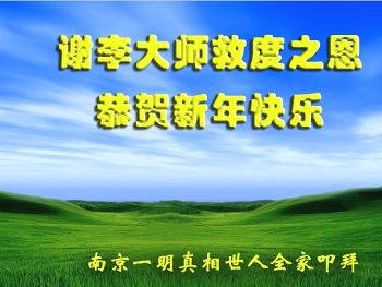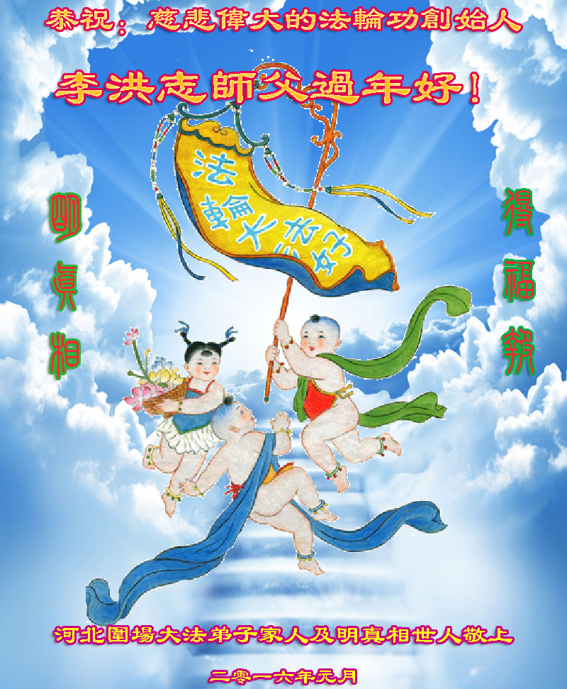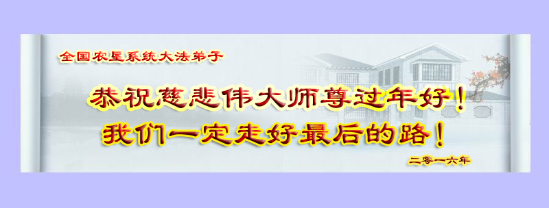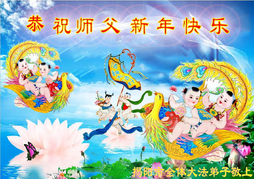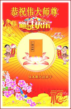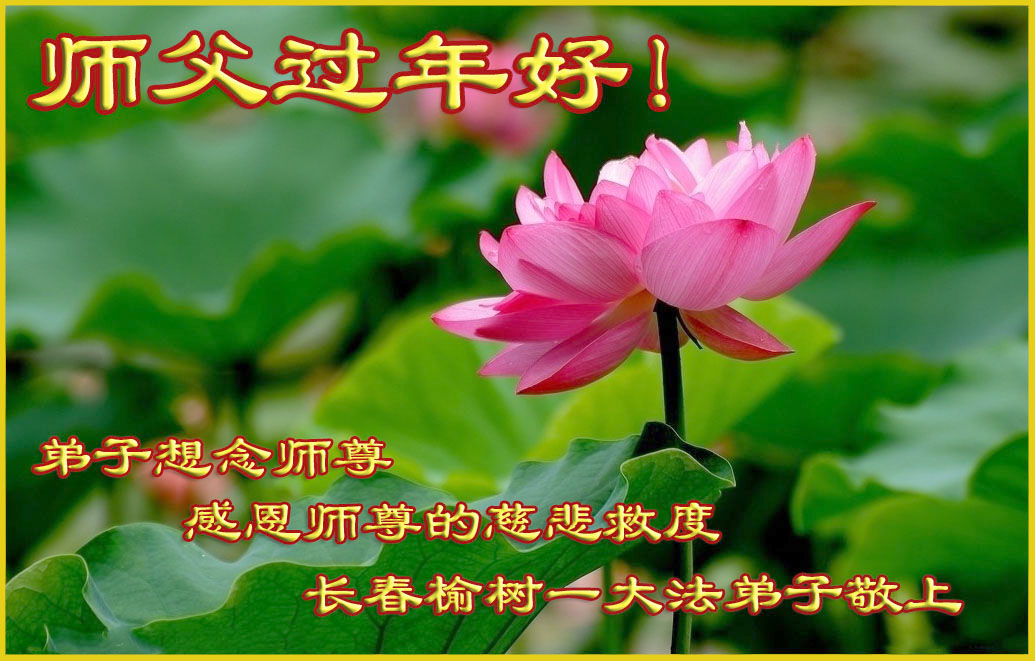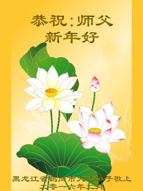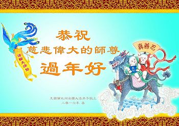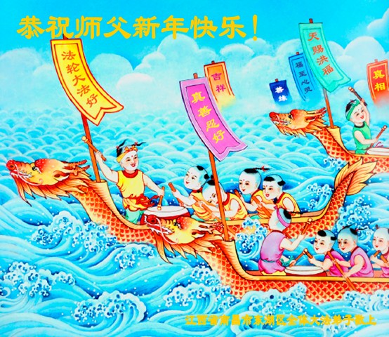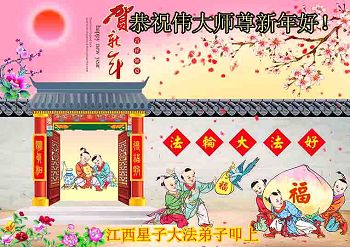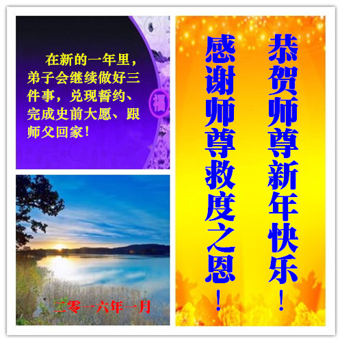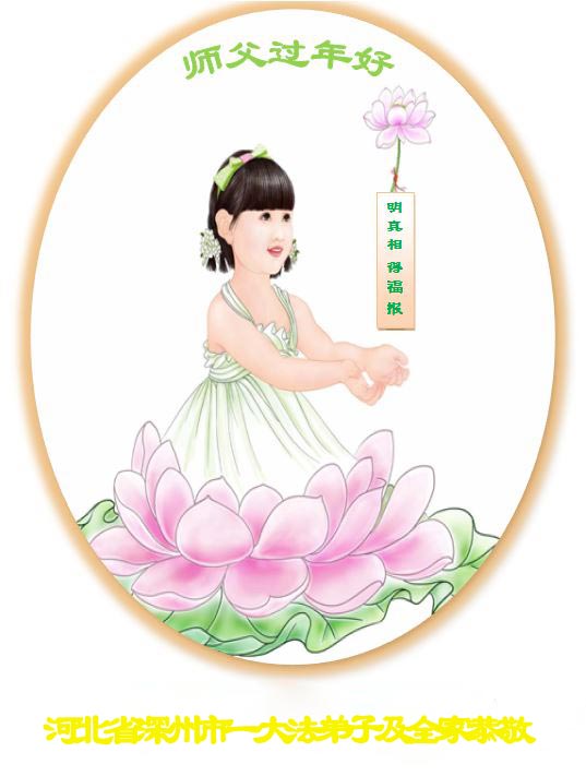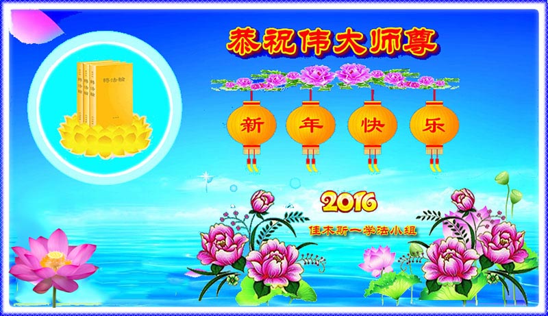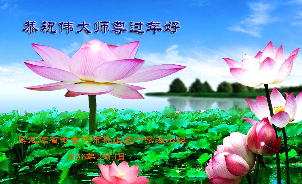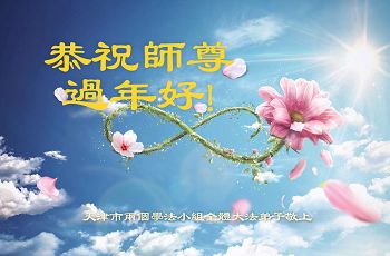 至尊无上的李大师新年好!穷尽人类的语言难以表达我们心中对李大师的无限感恩!法轮大法修炼者谨遵师命,按照真善忍的原则,遇事首先为他人着想的高贵品质,象一股清流涤荡着人类社会的一切邪恶!我们在此真心奉劝那些还被中共邪党蒙骗的世人,珍惜每一次法轮功弟子给你们的机会,明白法轮功真相,相信“法轮大法好”、“真、善、忍好”,给自己选择一个美好的未来!