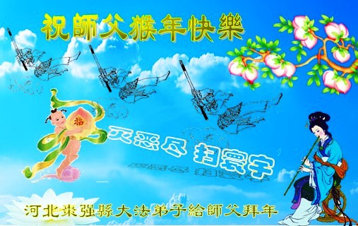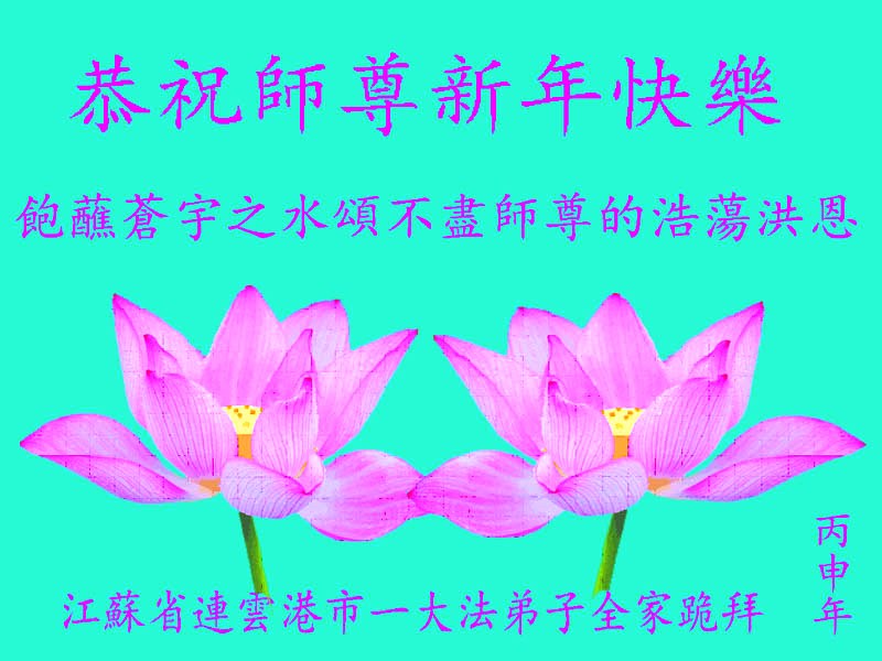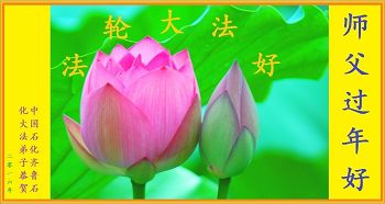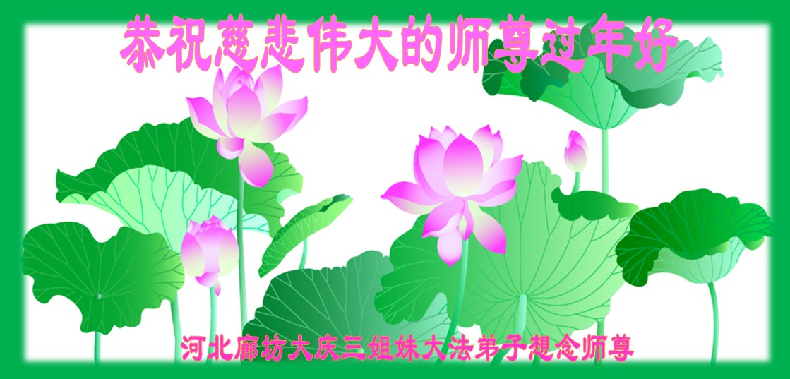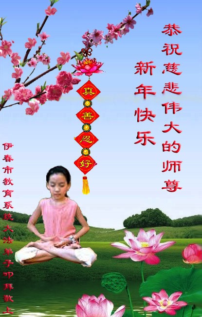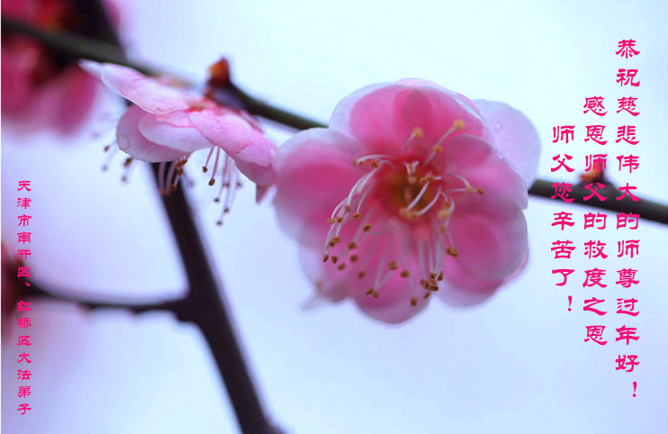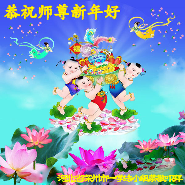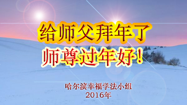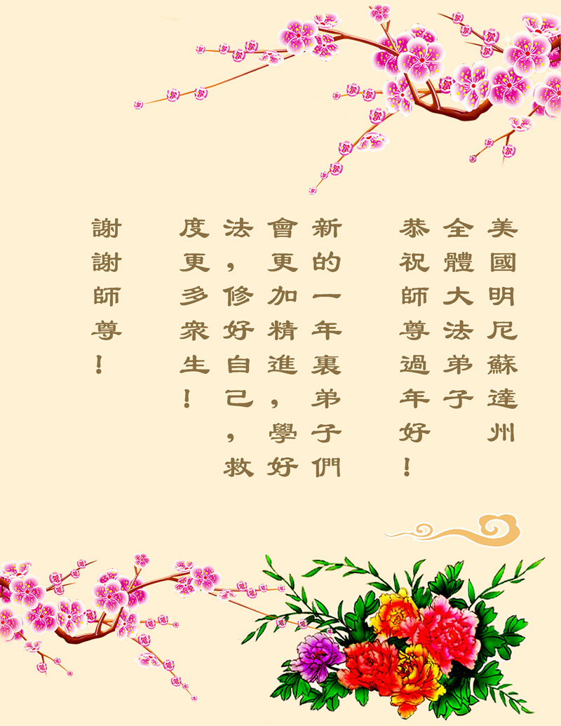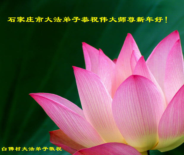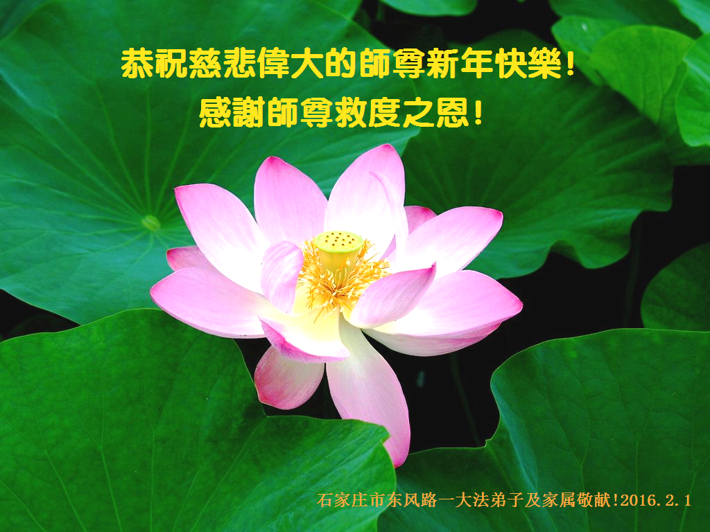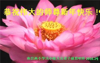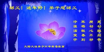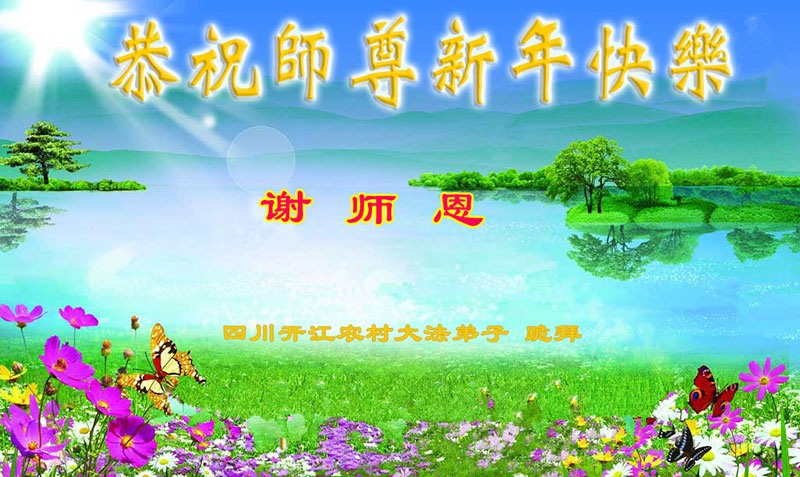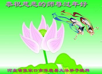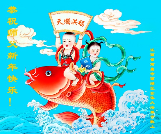 至尊无上的李大师新年好!穷尽人类的语言难以表达我们心中对李大师的无限感恩!法轮大法修炼者谨遵师命,按照真善忍的原则,遇事首先为他人着想的高贵品质,象一股清流涤荡着人类社会的一切邪恶!我们在此真心奉劝那些还被中共邪党蒙骗的世人,珍惜每一次法轮功弟子给你们的机会,明白法轮功真相,相信“法轮大法好”、“真、善、忍好”,给自己选择一个美好的未来!