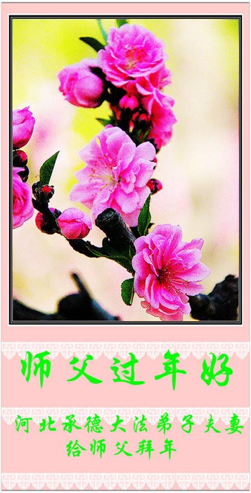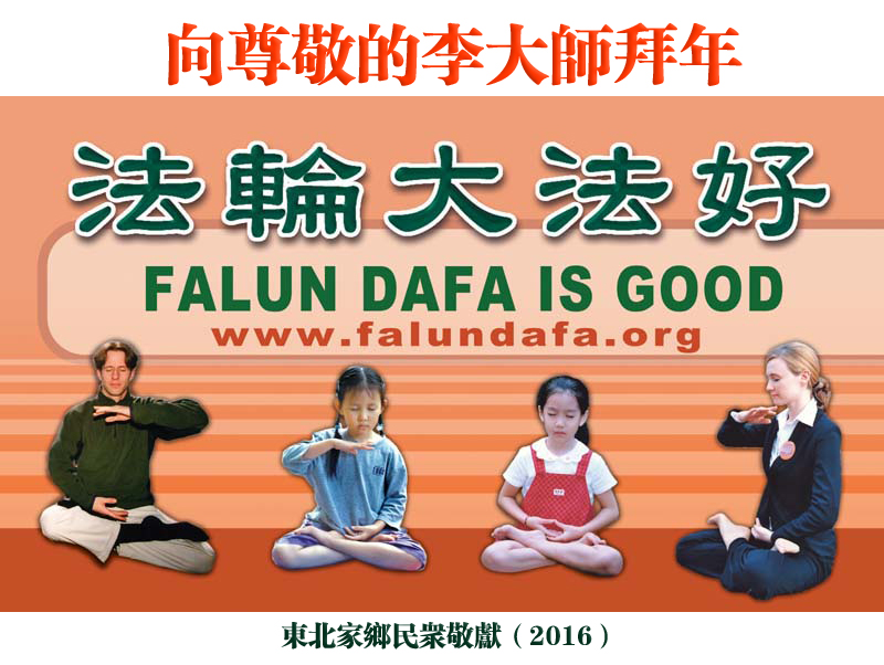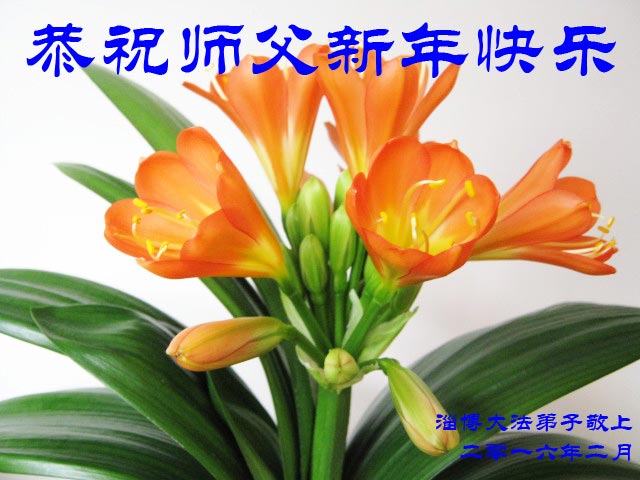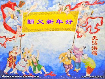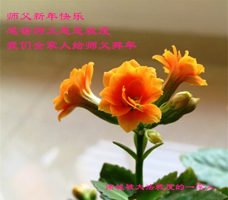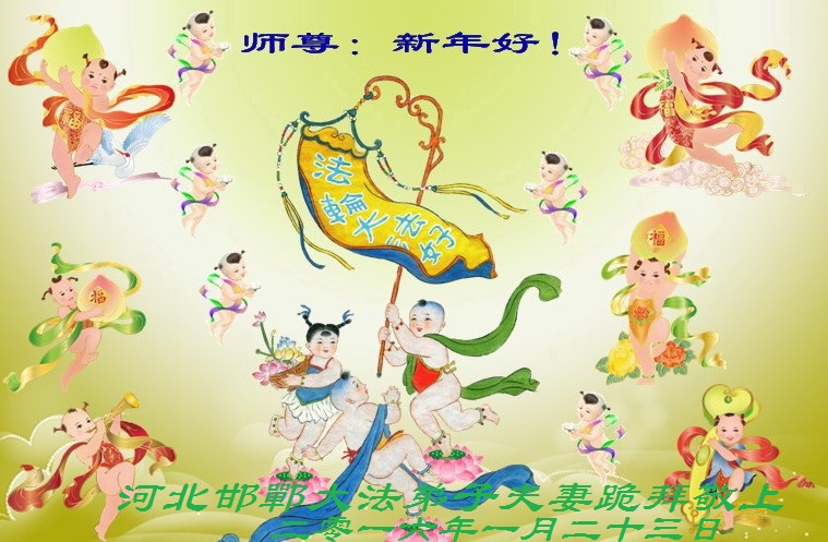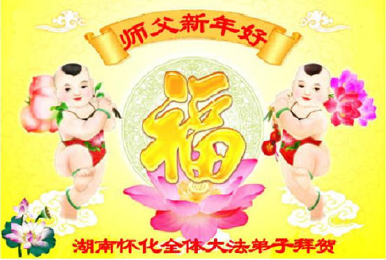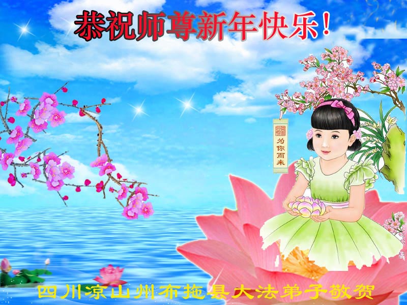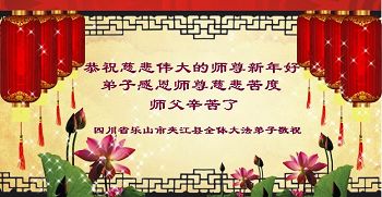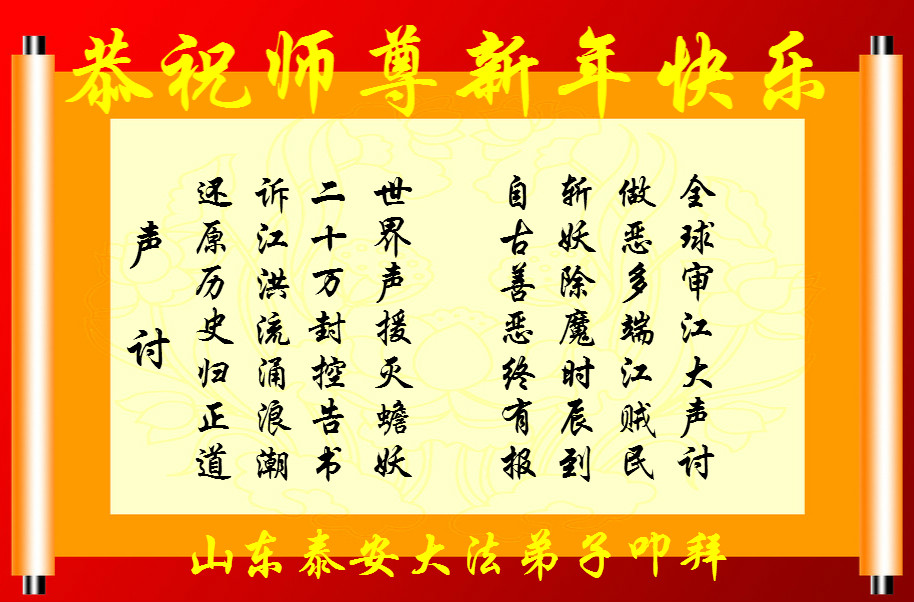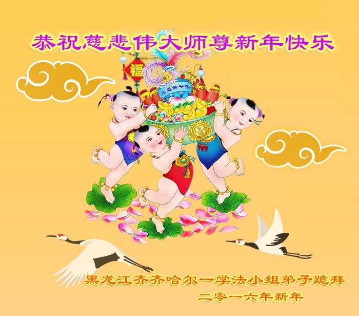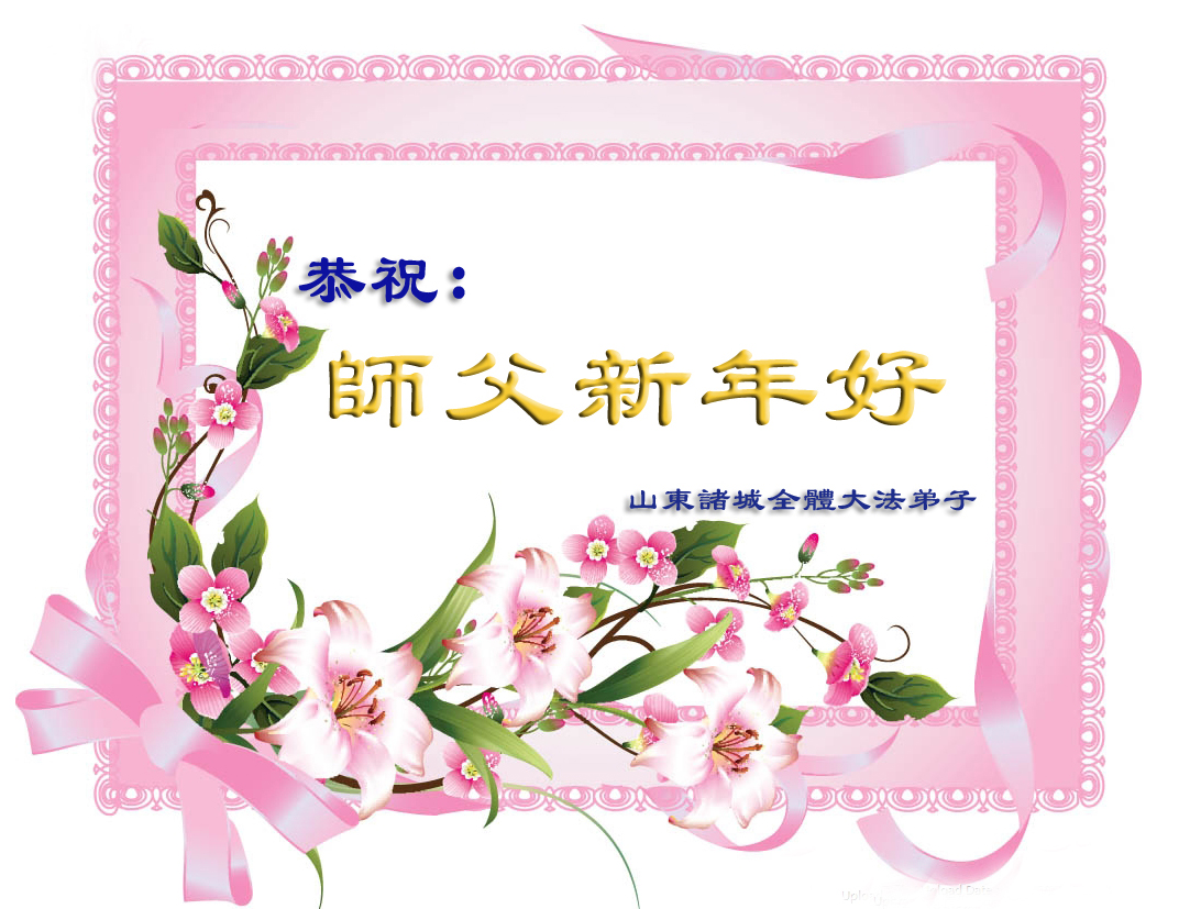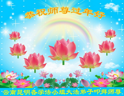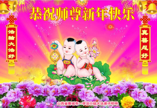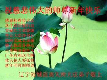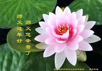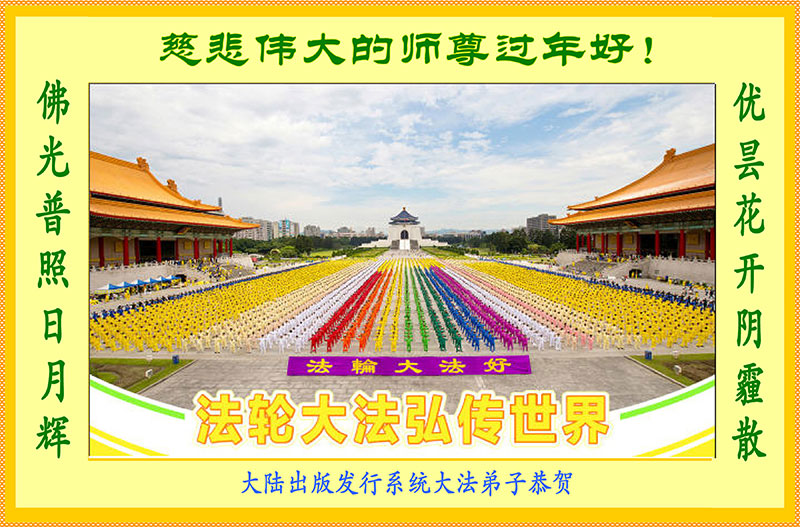至尊无上的李大师新年好!穷尽人类的语言难以表达我们心中对李大师的无限感恩!法轮大法修炼者谨遵师命,按照真善忍的原则,遇事首先为他人着想的高贵品质,象一股清流涤荡着人类社会的一切邪恶!我们在此真心奉劝那些还被中共邪党蒙骗的世人,珍惜每一次法轮功弟子给你们的机会,明白法轮功真相,相信“法轮大法好”、“真、善、忍好”,给自己选择一个美好的未来!