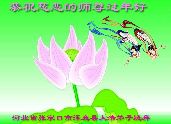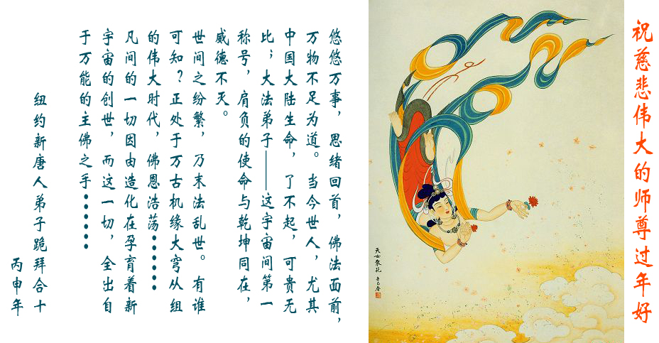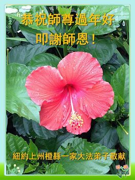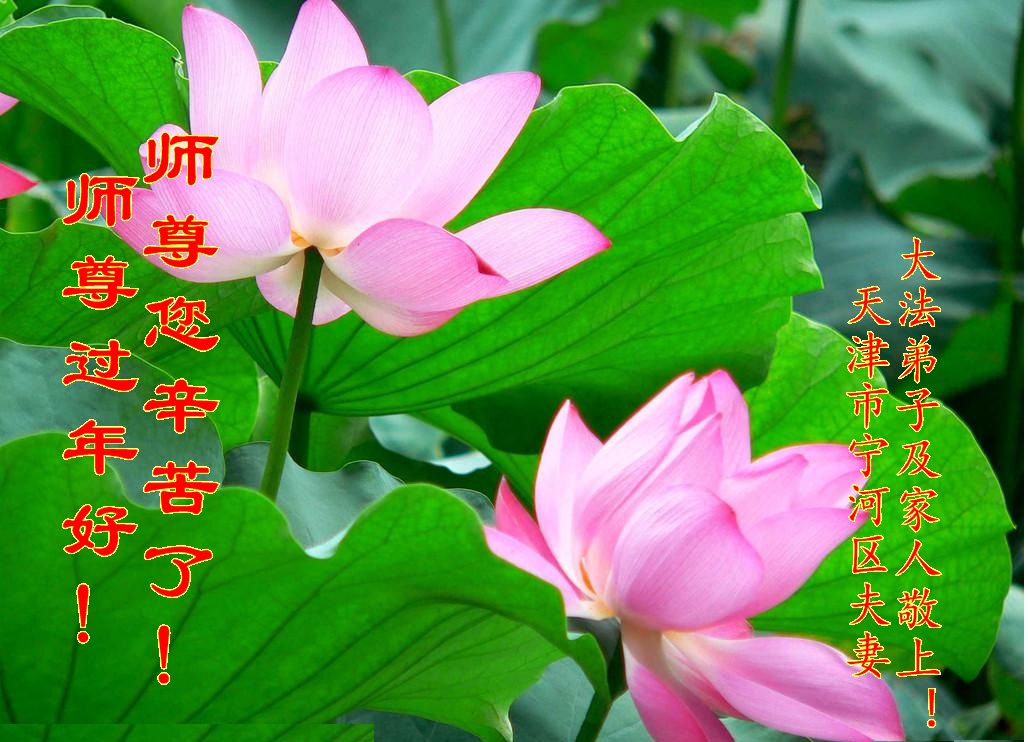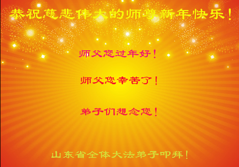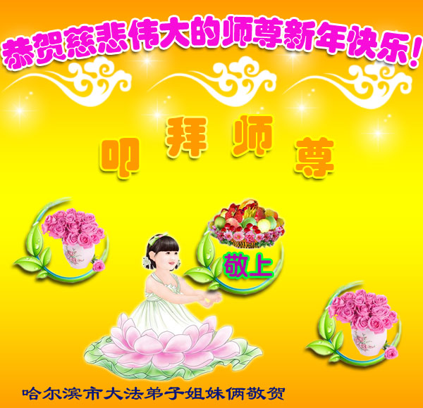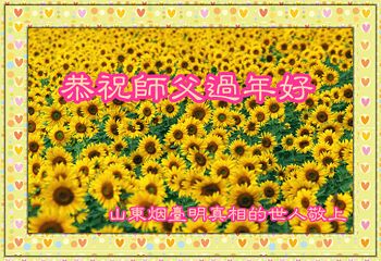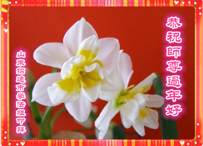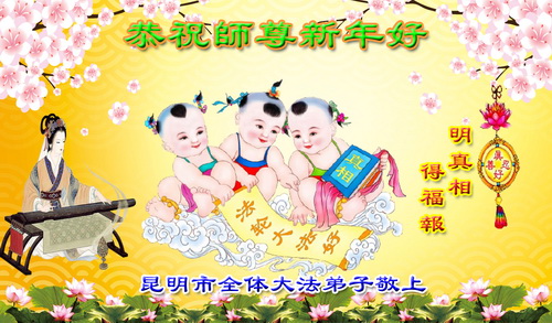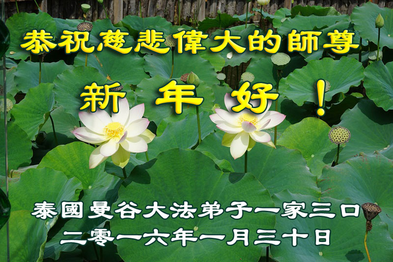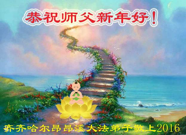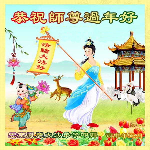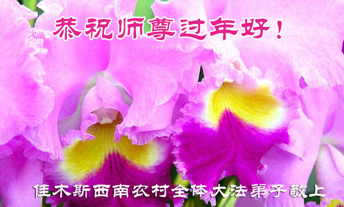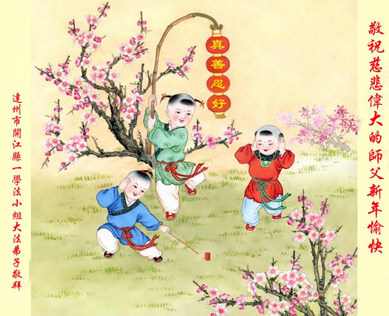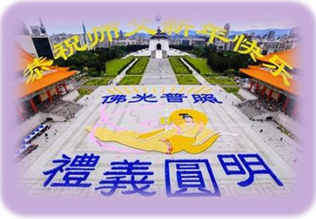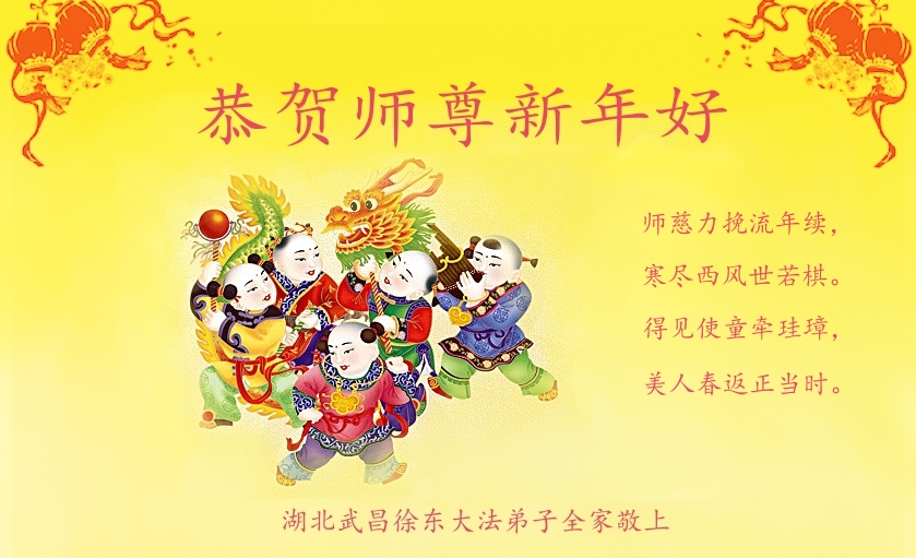 至尊无上的李大师新年好!穷尽人类的语言难以表达我们心中对李大师的无限感恩!法轮大法修炼者谨遵师命,按照真善忍的原则,遇事首先为他人着想的高贵品质,象一股清流涤荡着人类社会的一切邪恶!我们在此真心奉劝那些还被中共邪党蒙骗的世人,珍惜每一次法轮功弟子给你们的机会,明白法轮功真相,相信“法轮大法好”、“真、善、忍好”,给自己选择一个美好的未来!