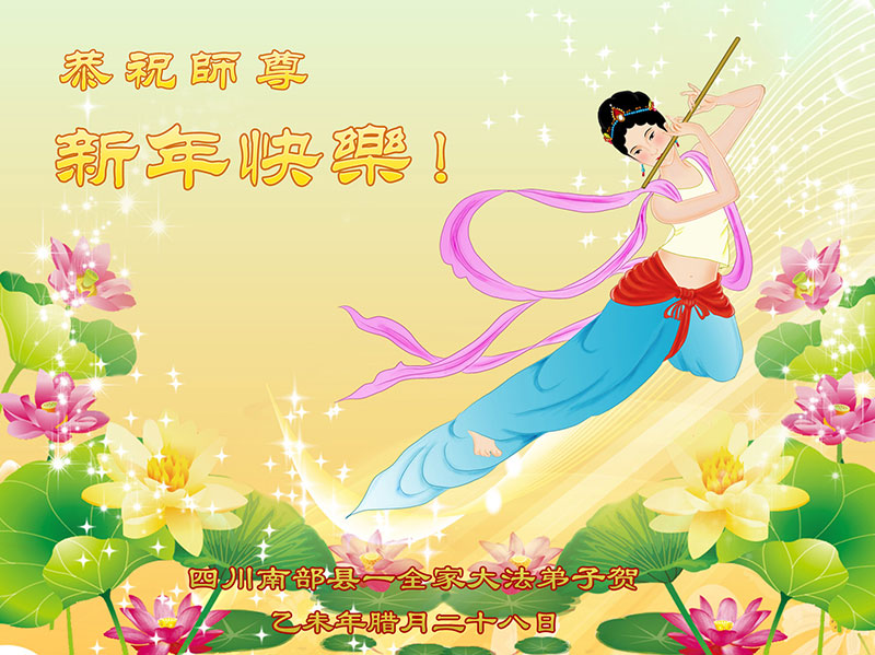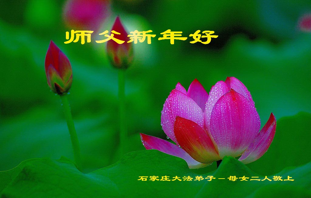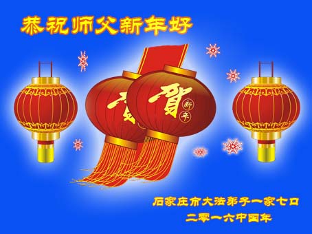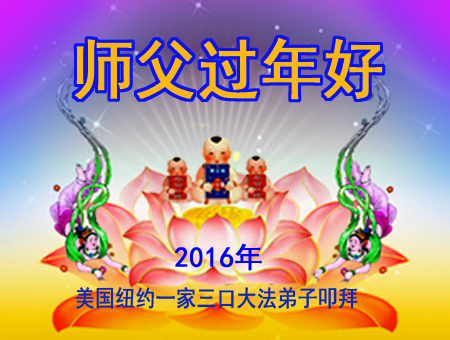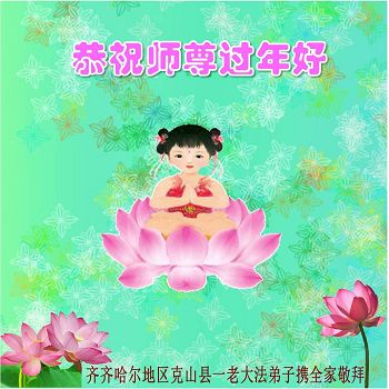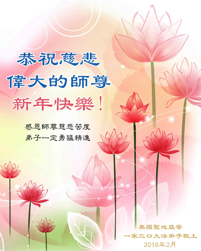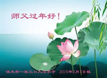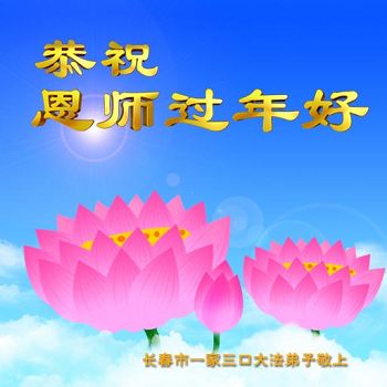 我们是明白真相的大法弟子的家人,虽然我们还没有真正走入修炼,但大法真、善、忍的精神早已经走入了我们心中,在认同支持大法弟子的同时,我们的身心都曾经受益匪浅!在新年来临之际,我们向伟大慈悲的大法师父真心的说一声:谢谢您!祝您新年快乐!早日回国!