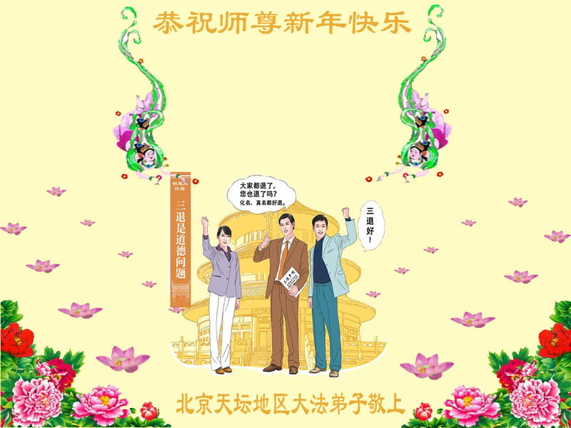 尊敬的李大师您好,新年到来,我们代表亲朋好友及明白大法真相的世人,向慈悲的李大师致以诚挚的问候!在此,我们呼吁所有还受中共邪党蒙骗的世人,赶快“三退保平安”,珍惜神佛的慈悲,为自己选择美好的未来!得救的生命跪谢李大师!